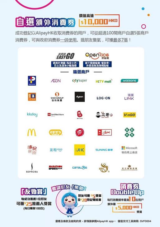 在消費券發放後,登記人即可於超過10萬間AlipayHK合作商戶消費。