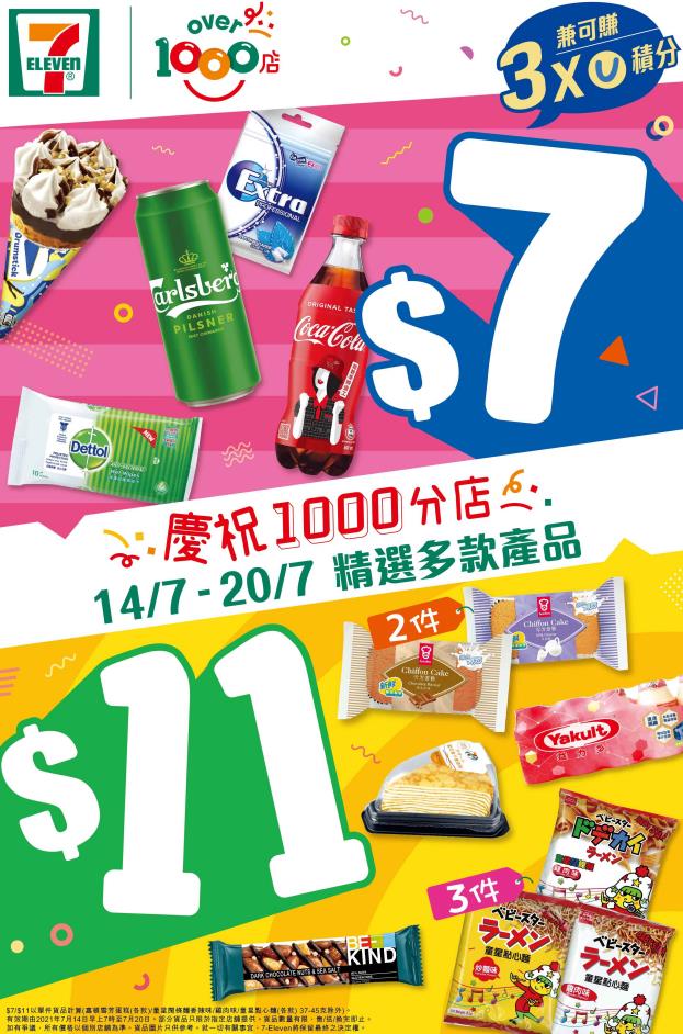 7-Eleven為慶祝第1000間分店開業,推出限時一星期的抵買優惠。由2021年7 月14日早上7時至7月20日,多款產品會以HK$7及HK$11優惠價發售,包括夏日消暑佳品汽水及甜筒,精選推介有雀巢甜筒(各款)以超值價HK$7發售。另外,欣賞球賽必備的啤酒及零食,以及呵護家人的殺菌用品等,同樣有優惠。