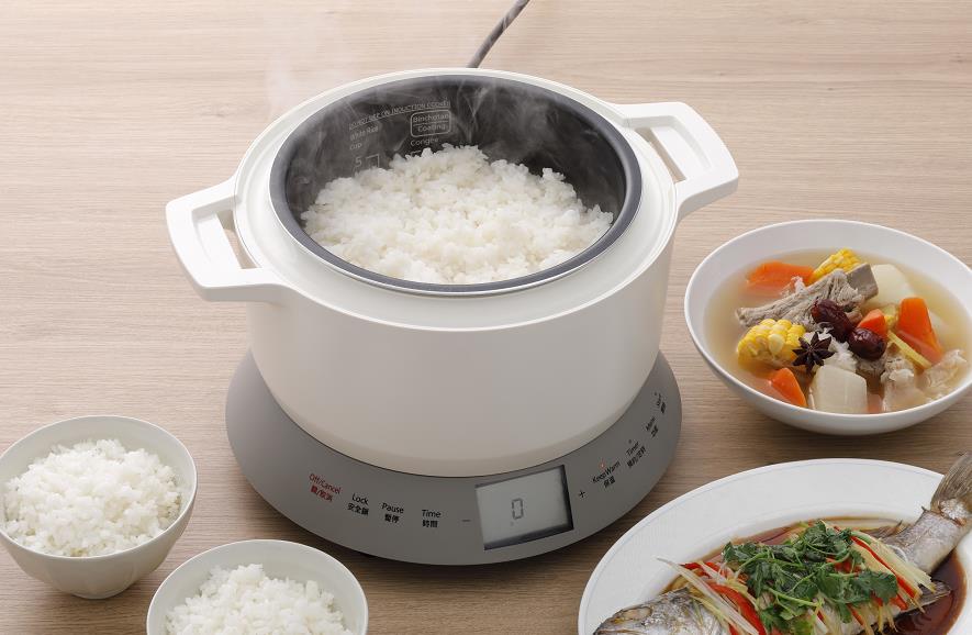 電飯煲由上面白色飯煲及煲下的電磁爐組成,採用外置加熱方法煮飯,有別傳統電飯煲在機身內加熱的設計。