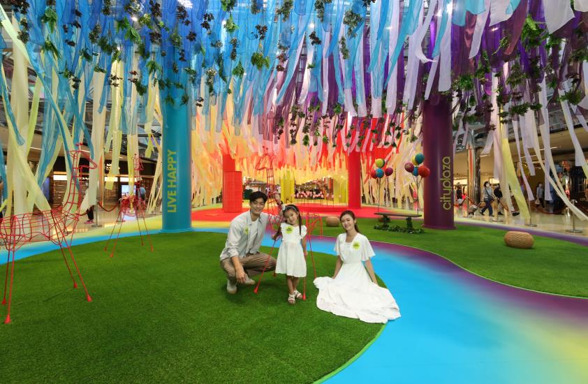 商場二樓中庭入口設有「LIVE HAppY 快樂識放」燈箱,溫馨提示大家放下煩惱,「見字放鬆」,欣賞色彩繽紛的藝術裝置。色彩繽紛的彩帶從高處垂下,猶如數十條彩虹劃破天空,展現雨後放晴的清新景象,是打卡首選位置。