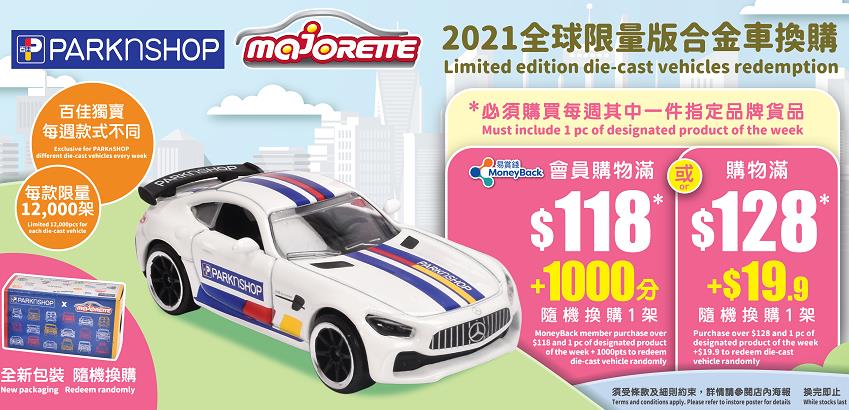 百佳與Majorette合金車系列2.0推出新的換領方式,活動期內,只需於任何一間香港或澳門超市分店購物滿指定金額,倂購買其中一件每周指定品牌貨品,即可以易賞錢積分或優惠價換領小朋友至愛的合金模型車一架。活動期間,將每周推出3至4款指定合金車,每周指定品牌亦有所不同。易賞錢會員購物滿HK$118倂購買其中一件指定品牌貨品,再加易賞錢1000積分,即可換領;或買滿HK$128倂購買其中一件每周指定品牌貨品,亦可以優惠價HK$19.9換購上述模型車。今次推出的20款模型車,各自印上不同的品牌標誌,如寶礦力水特、吉百利、子母、雀巢等,港人倍感親切。