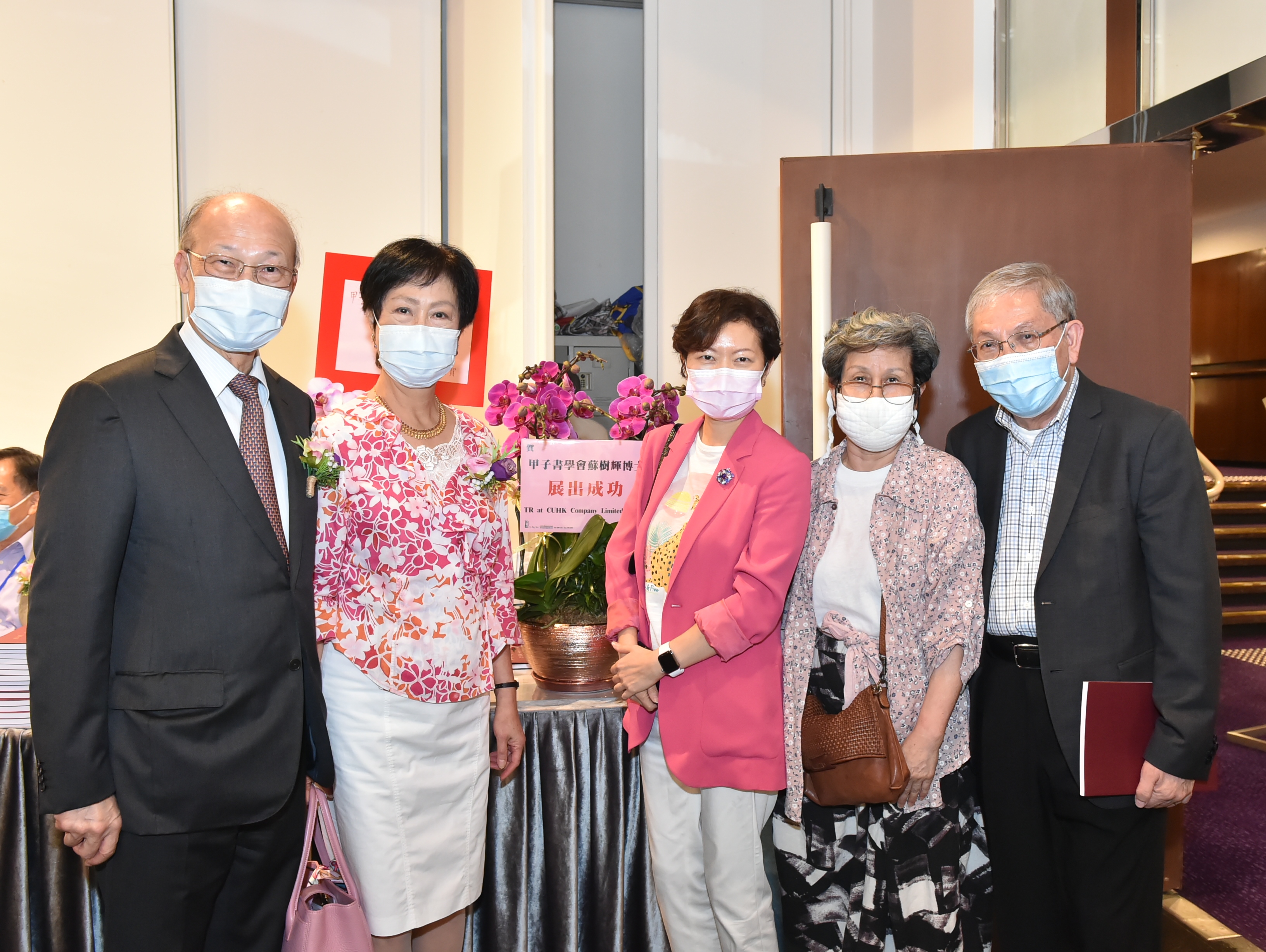 香港中文大學副校長陳偉儀(右一)與蘇樹輝伉儷(左一、二)出席書法展。