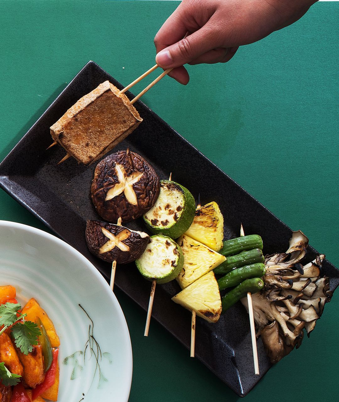 J’s Bar Bistro主打日式串燒,素食菜譜當然首推串燒,素食串燒選擇包括蜜糖菠蘿、味噌翠玉瓜、豆腐、甜薯、香菇、小青椒及植物肉等,每串即點即燒。其他頭盤包括五色番茄配純素水牛芝士雪糕、素凱撒沙律伴脆炸素食植物肉及紅白味噌燒日本茄子等。