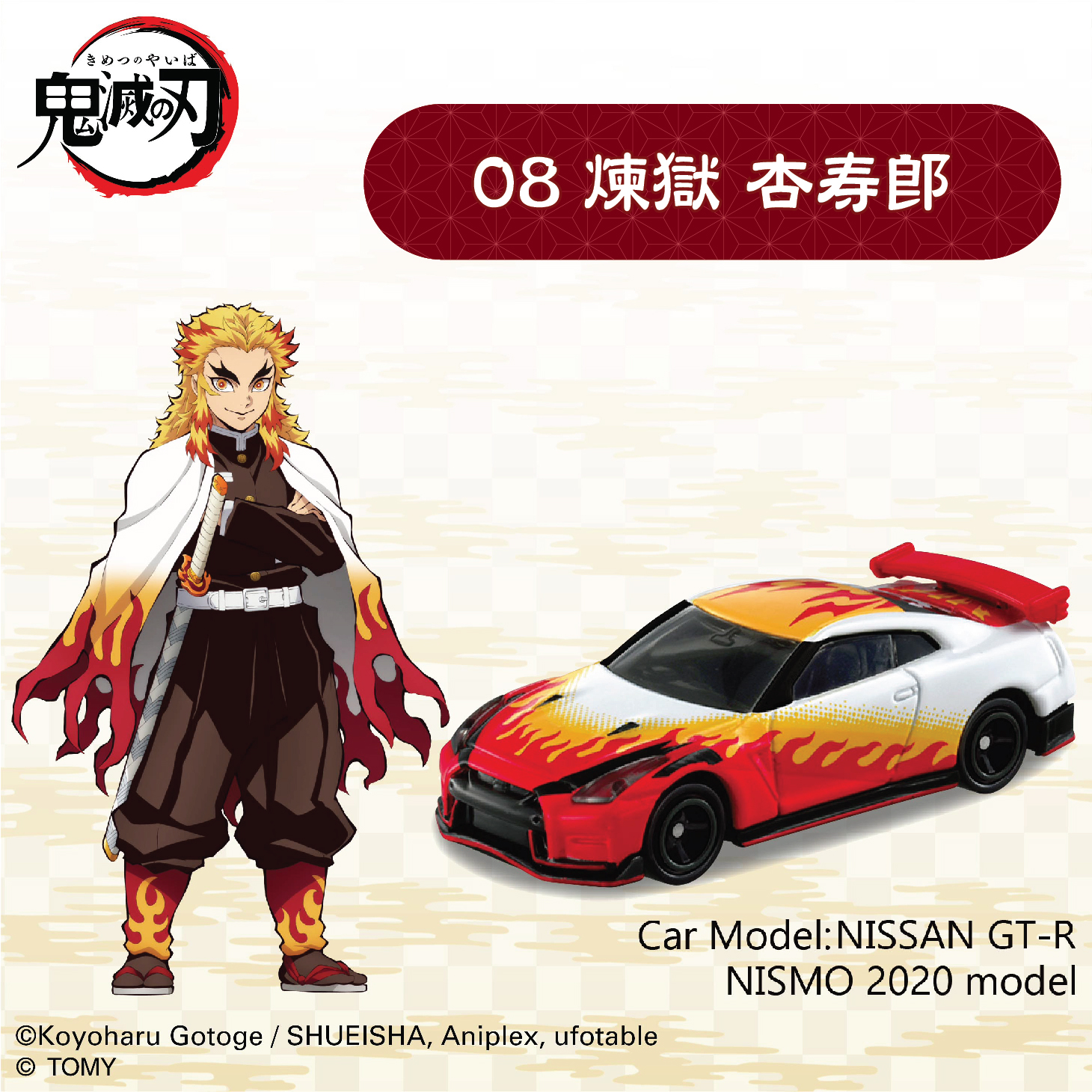 TOMICA X《鬼滅之刃》系列,煉獄杏壽郎(炎柱),Nissan GT-R跑車車身配備火焰圖紋。
