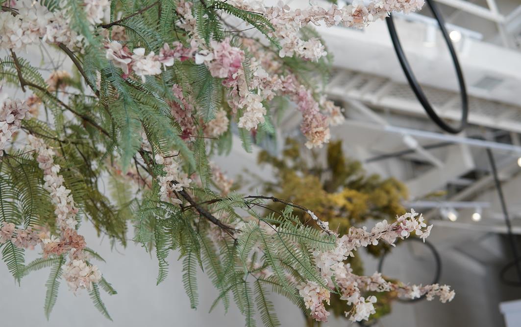 一棵模仿節果決明型態的巨型樹枝裝置,由樹枝、保鮮雨傘芒和保鮮繡球花編織而成,懸空吊掛在天花板上。