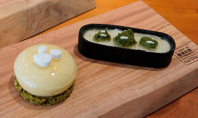 與本地純素甜點工作室「地衣菓子」合作推出兩款純素甜點:熱情果開心果慕絲(左)、小山園抹茶柚子撻(右)。