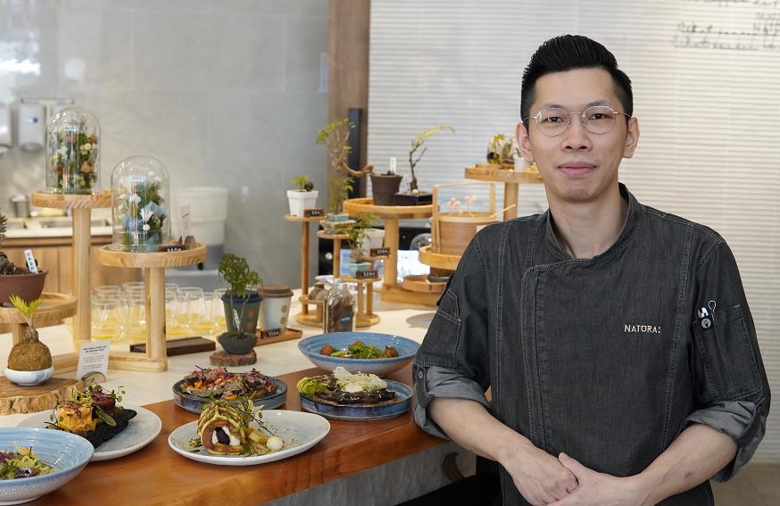 黃宇陽擁有16年入廚經驗,曾在法式餐廳、意式餐廳、酒店、咖啡店等工作,這些經歷豐富了他的視野,令他擅長設計不同國家的料理。他主張「多菜少肉」,拒絕以牛肉入饌,以及重視視覺效果,他說:「別人是先聲奪人,而我則強調先『色』奪人,食物好味之餘,賣相要夠精美,特別是顏色配搭,所以在考慮菜單時,會率先回憶哪些食材能與樹木的顏色呼應,再不斷嘗試各種配搭效果。」當食物上桌時,食客不難發現幕後的廚師有多注重形象美感。在侍應端來溫泉蛋牛油果大啡菇酸種麵包時,記者驚嘆這道菜式實在像真,主角大啡菇切成片狀,營造出「古樹」的木紋效果。輕盈清新又富含膳食纖維的蒟蒻麵,加上了顏色繽紛的食用花及水耕沙律菜,頓時生色不少,果然出「色」。 (記者:Ruth 攝影:Janice)