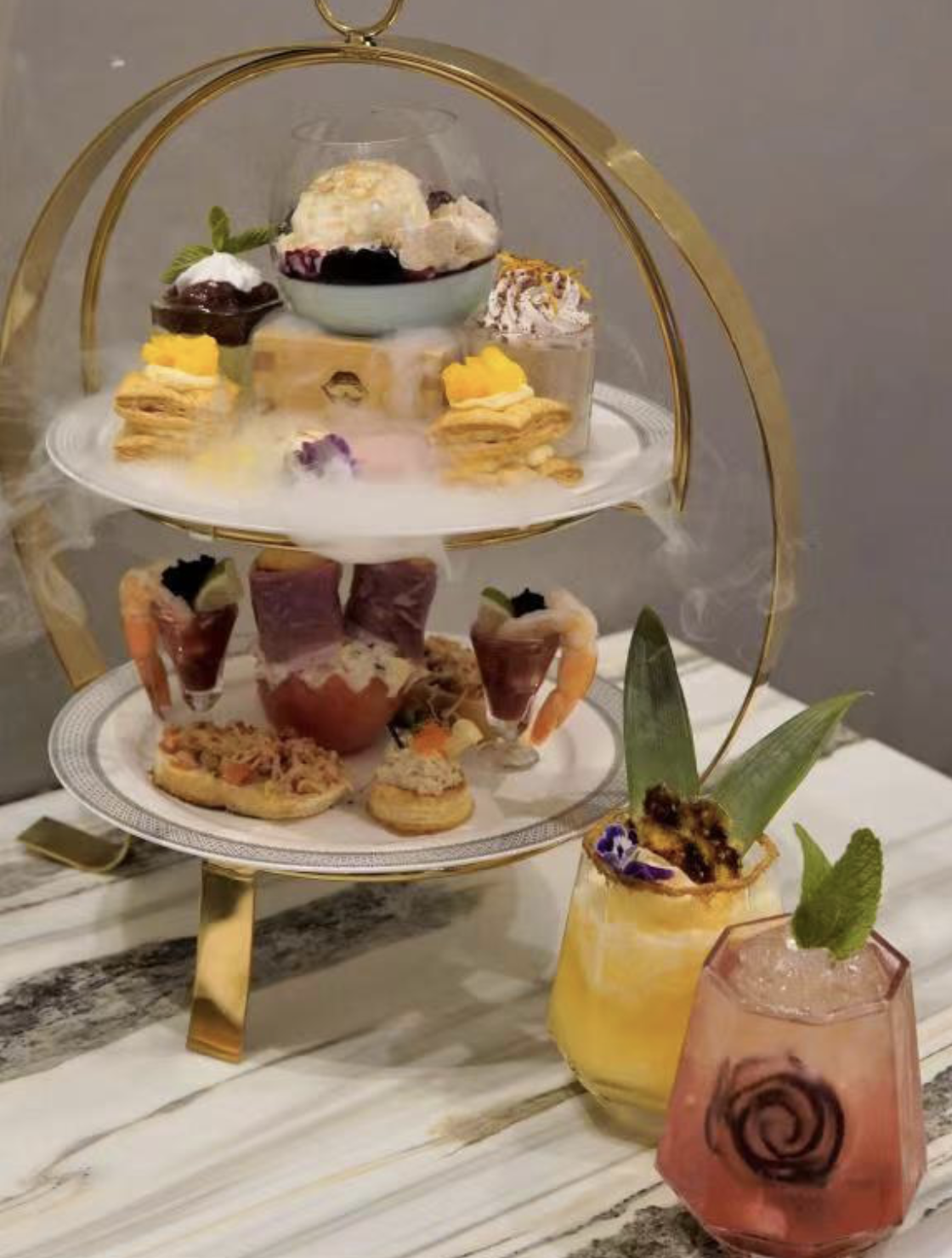 在兩層金屬架上,放滿了以夏日鮮果入饌、合共9款的精緻鹹甜美點,精心的擺盤設計與充滿夏日風情的美食特飲予人視覺與味覺的享受。而且上枱時會安排乾冰,營造出煙霧瀰漫的仙氣效果,打卡一流!