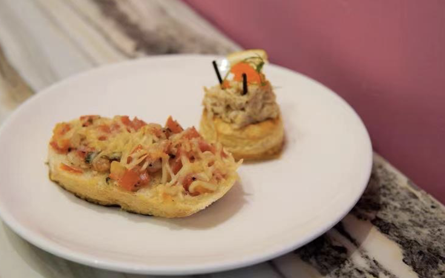 意式番茄多士(前)及蟹肉蟹籽酥皮盒(後)。