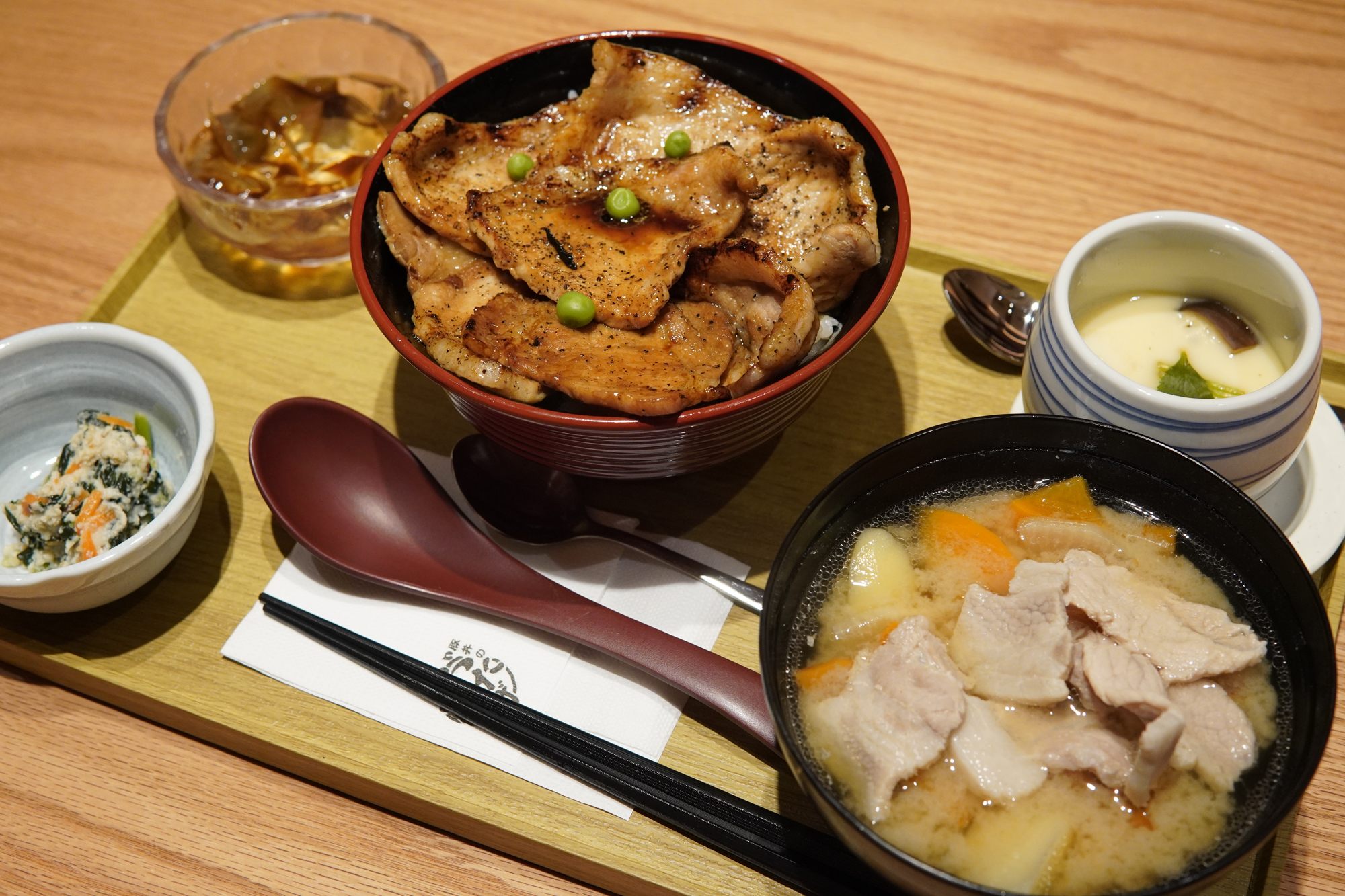「帶廣名物稀有豚肉丼」, 特盛HK$112。另有並盛HK$92。可加配定食,包括味噌湯、茶碗蒸等,加上豚肉味噌湯,定能讓嗜肉者十分滿足。