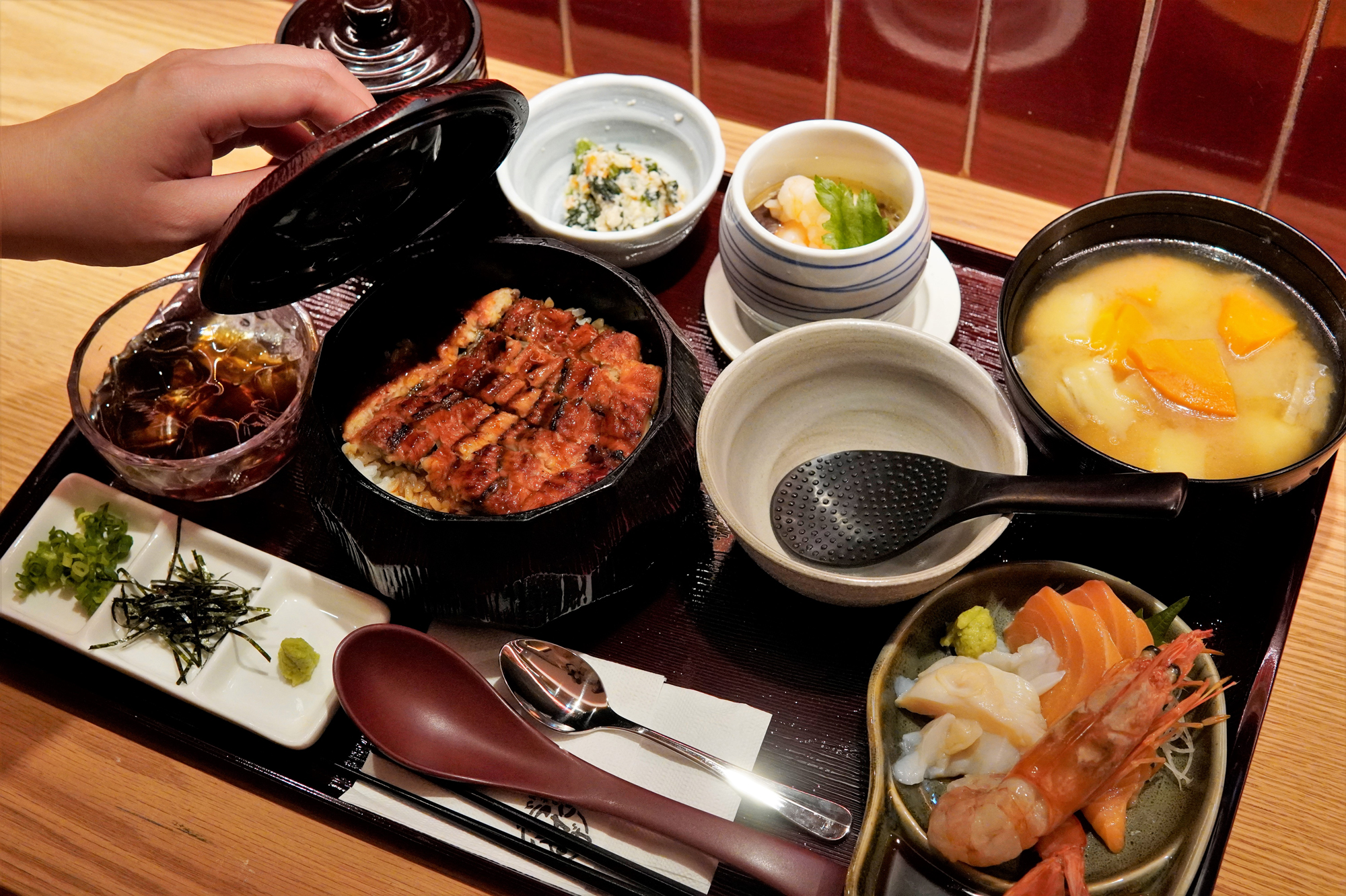 「鰻魚三味御膳」(配味噌湯、副菜、茶碗蒸、刺身、甜品),HK$168。(每日下午6時後供應)