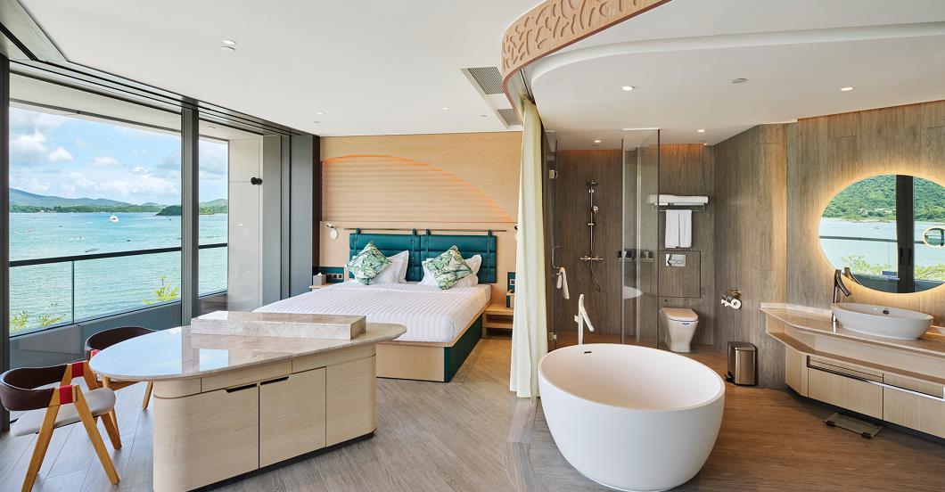 每座建築都是地上三層連接地下三層平台,共設260間舒適雅致的客房,70%的房間均可眺望遼闊海景。酒店大部分客房均有寬敞露台,頂層部分客房設有內置樓梯直達私人天台,首層部分客房更設有專屬私人花園。