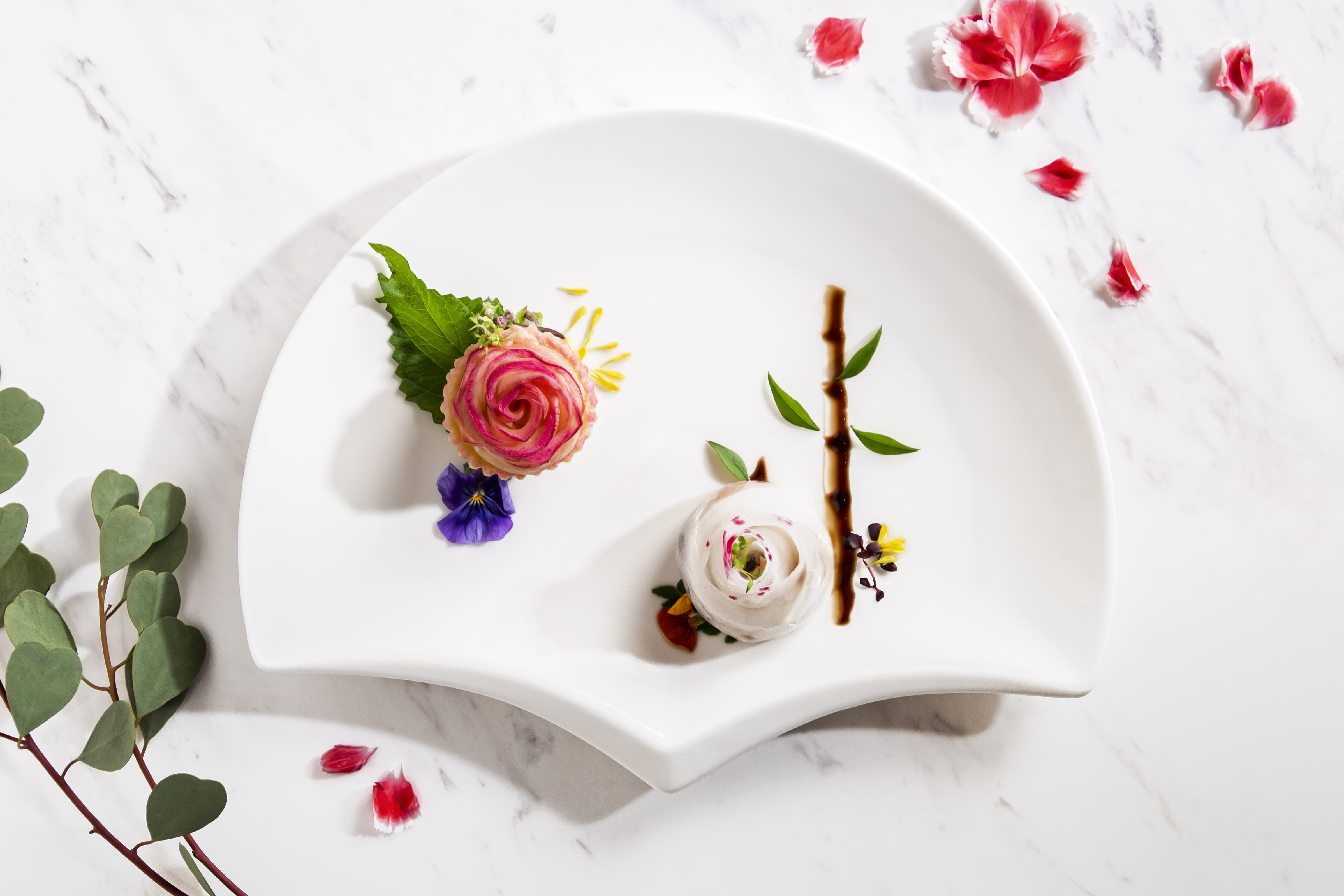 張氏於《紅玫瑰與白玫瑰》中有不少愛情金句,紅玫瑰與白玫瑰各有長短,江師傅就把張氏對兩者的描述,再加以想像創作出紅影金酥與瑰麗花餃,一紅一白,互相輝映,前者將蘋果切片蒸軟捲成玫瑰花形,之後置於酥皮上同焗,後者先炒香野菌,再以蝦餃皮將鮮百合及野菌捲成玫瑰花形蒸煮。