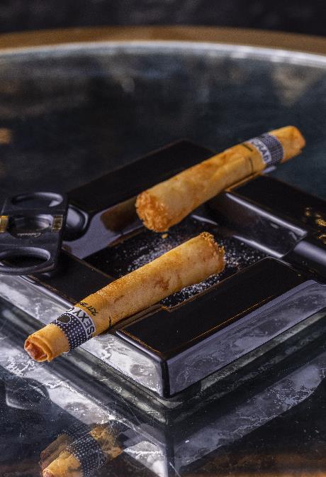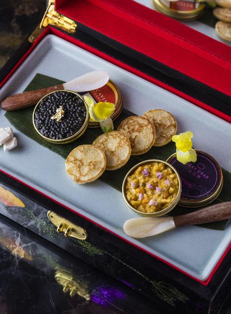 店內設計以30年代的上海酒廊為靈感,最近推出的「復刻老上海:懷舊蟹宴」嘗味菜單精心設計了多款吸睛菜式,菜單包括奉送「BOTTEGA Prosecco」一瓶,三款前菜,兩款主食及一款甜品。前菜有「魚子醬丶醉蟹粉及忌廉芝士配布林餅」以招牌黃金比例4比6的蟹肉及蟹膏炮製的蟹粉,而蟹膏的公母比例更精準至58%比42%,以精巧的布林餅蘸上蟹粉或魚子醬同吃,風味極致。「松葉蟹春卷」還原雪茄的模樣,將老上海的幽雅風情表露無遺,精巧的春卷內是日本松葉蟹肉丶明太子及蝦醬,綴以碟上維妙維肖的梅子鹽「煙灰」,巧妙地提升「雪茄」的鹹鮮風味。湯品「蟹粉黃魚濃湯」,湯底以鮮黃魚熬製八至十小時而成,並加入比例各佔一半的蟹肉及蟹膏,呈獻只此一家的非凡鮮味。
