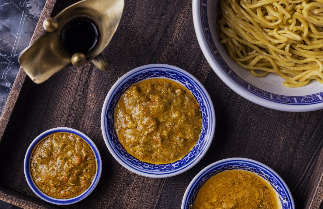 主菜方面,有最新設計的「蟹粉百花遼參」,以營養豐富的日本關東頂級海參入饌,取其質感柔滑,口感黏軟。另一道主菜是店內的招牌麵食「特濃蟹粉蟹肉拌拉麵」,用足12隻螃蟹的蟹粉,團隊於上桌時更會將麵條及配料,包括「雞湯配蟹肉」丶「蟹腳肉」丶「蟹公膏」丶「蟹母膏」丶「蟹油」分開呈上,讓賓客可自行加入配料,按個人喜好將以中式瓷器盛裝的醬油及蟹醋倒入,拌勻成其獨一無二的蟹黃麵。甜點「燕窩杏仁豆腐配時令水果」,以透心涼的自家製杏仁豆腐搭配時令入口水果,滋潤養顏,綴以矜貴燕窩及點點金箔,為蟹宴畫上完滿句號。 (記者:Janice)