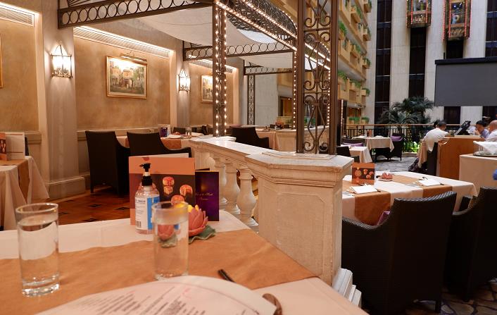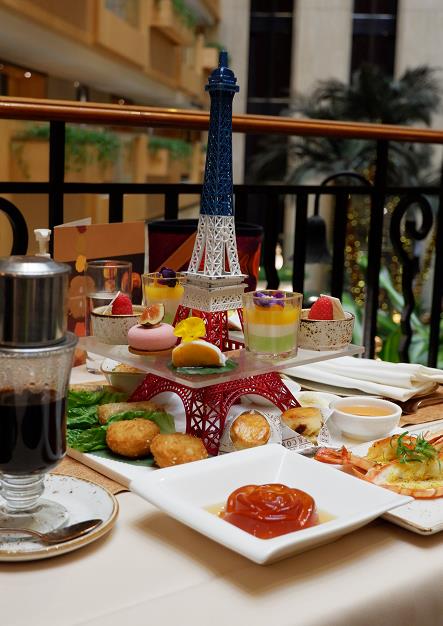 餐廳位於帝苑酒店三樓,花園的設計恍如法式庭園,玻璃天窗透射陽光,聽著噴泉的流水聲,感覺清幽寫意,一掃心中悶煩,十分適合閨密相聚。最近,餐廳聯乘茶葉品牌Salley’s Garden,推出「越式夢幻茶香下午茶」,在經典的艾菲爾鐵塔層架上提供一系列美食。