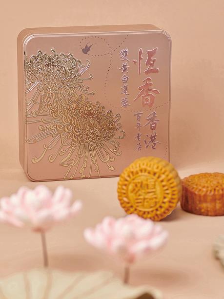 品牌最經典的月餅必數雙黃白蓮蓉月餅,飽滿圓潤的月餅用頂級湘潭貢蓮製成,由擁有四十多年經驗的老師傅以古法銅鑊炒煮的方式手工製作,以便保存純正蓮蓉的清、甜、香,今年月餅盒並換上高雅的玫瑰金色。流心奶黃月餅是港人喜愛的新派月餅之選,品牌的流心奶黃月餅以吉士奶香配上牛油曲奇皮,秘製奶黃餡夾著甘香幼細鹹蛋黃碎,翻熱後流心更細緻幼滑,甜中帶鹹。而月餅盒則為全新設計,以中式燙金窗櫺嵌於月亮剪影之中,由一對玉兔遙望窗外明月,洋溢中秋氣氛。