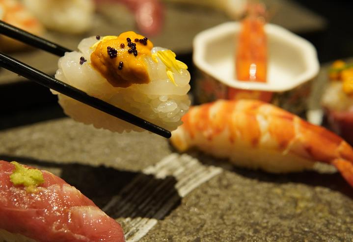 今年的「職人壽司」系列即日起至10月3日於全線分店供應,分兩個階段進行,第一階段即日起至9月7日供應。系列以奢華上乘魚鮮為主題,包括馬糞海膽配搭炙燒和牛、富山縣白蝦、慢煮龍蝦或大吞拿魚腩;吞拿魚頭蓋肉(腦天)、沖繩縣產車海老及北海道產特大珍寶帶子等,配以不同特級佐料匠心雕刻而成。每個階段會提供6款時令壽司,第一階段的壽司包括炙燒和牛馬糞海膽、馬糞海膽配白蝦、吞拿魚頭蓋肉(腦天)、真鯛伴鮟鱇魚肝西瓜奈良漬、車海老及池魚卷。其中,筆者最推介炙燒和牛馬糞海膽,馬糞海膽濃厚甘甜,輕燒過的和牛則脂香肉嫩,加上魚油鮮香的三文魚籽,建議一口吃下,才能體會層次豐富的口感。真鯛伴鮟鱇魚肝西瓜奈良漬是筆者另一心頭好,真鯛屬白身魚類的「百魚之王」,油脂適中,味道清淡,以酸香開胃的西瓜奈良和濃郁綿密的鮟鱇魚肝襯托,味道濃淡得宜。