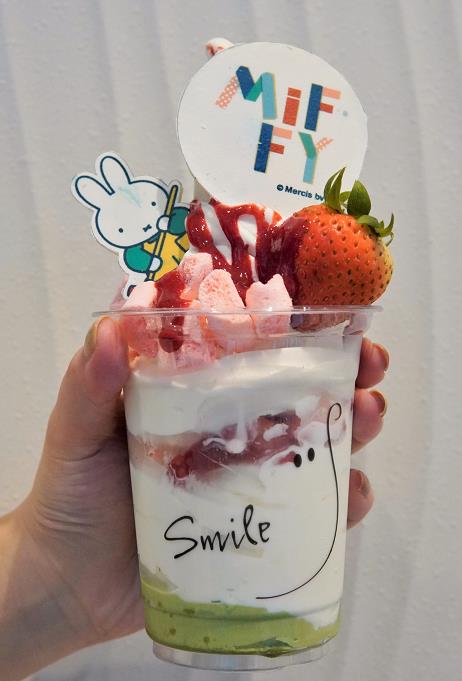 Smile Yogurt 推出期間限定Miffy’s Garden雪糕乳酪,底層是日本抹茶布甸,配上士多啤梨及士多啤梨脆脆,上層再以紅莓醬鋪面,味道酸甜。