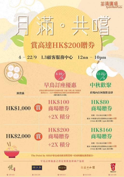 「月滿.共嚐」分早鳥訂座及中秋歡聚兩個階段:由即日起至9月10日,於指定餐飲食肆預早訂座即可獲「月滿.共嚐」電子預留證,憑證於9月11至22日消費滿指定金額,送你高達HK$200商場贈券及雙倍積分,賞月同時嘗盡美食,一眾識食人士萬勿錯過。同時廣場於9月11至22日推出的中秋歡聚則賞你高達HK$160商場贈券,成功換領獎賞時亦賺取消費積分,多買多賞,歡度佳節同時賺取最多獎賞。