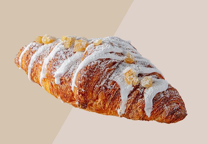 雪花檸檬牛角包在牛角包中注入酸甜的檸檬吉士醬,加入檸檬粒和糖粉點綴。