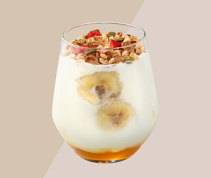 楓糖香蕉穀物燕麥乳酪以Oatly燕麥乳酪搭配香蕉、楓糖漿和香脆穀物。