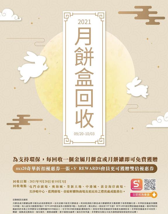 為鼓勵大家可以為環保出力,由9月20日起至10月3日只要將清潔好的任何品牌金屬月餅盒/罐,交到指定的信和集團商場內的禮賓處或服務台,即可換領奇華送出港幣20元折扣優惠券,而S+ REWARDS會員更可獲得雙倍優惠券驚喜。所有回收到的月餅盒/罐,將會全數捐贈予基督教勵行會作慈善用途。既可保護環境,又可做善事,一齊支持起動吧!(記者:雲遜)