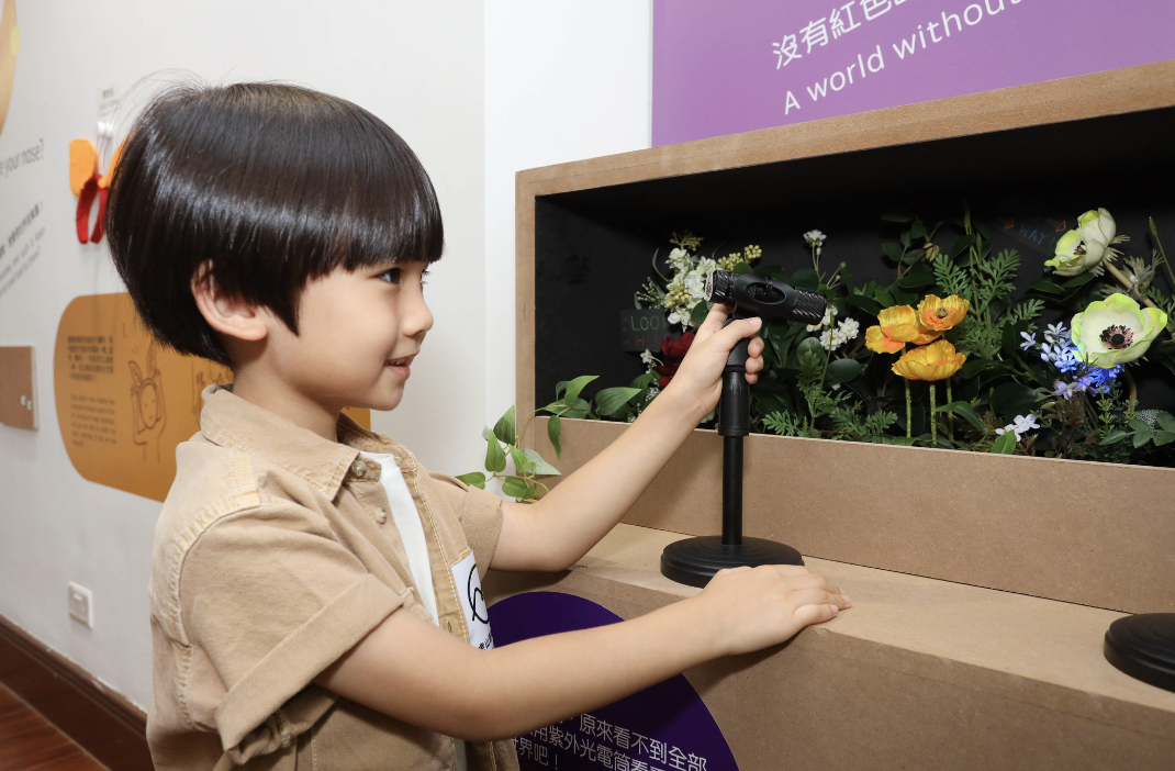 人與動物看到的顏色可以很不同,蜜蜂看不到紅色,卻能看到人類看不見的紫外光。小朋友可以用UV電筒,看看蜜蜂眼中的世界,尋找花朵為蜜蜂提供「採蜜路徑」。