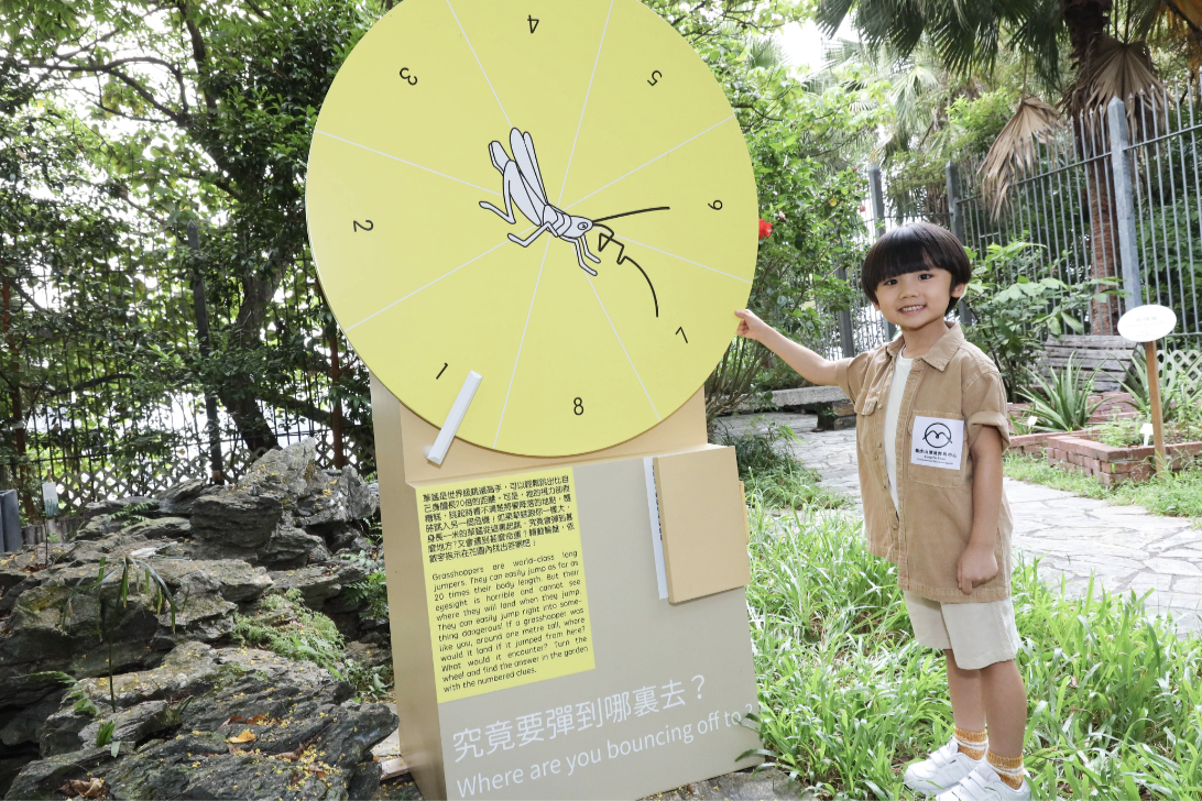 草蜢是世界級跳遠高手,可以輕鬆跳出比自己身體長20倍的距離,卻因視力不好,看不清楚將要降落的地點,隨時跳入另一個危機。小朋友可轉動輪盤,隨機轉出草蜢的降落點,然後在中心花園尋找相應目的地,看看草蜢的命運。(記者:雲遜)