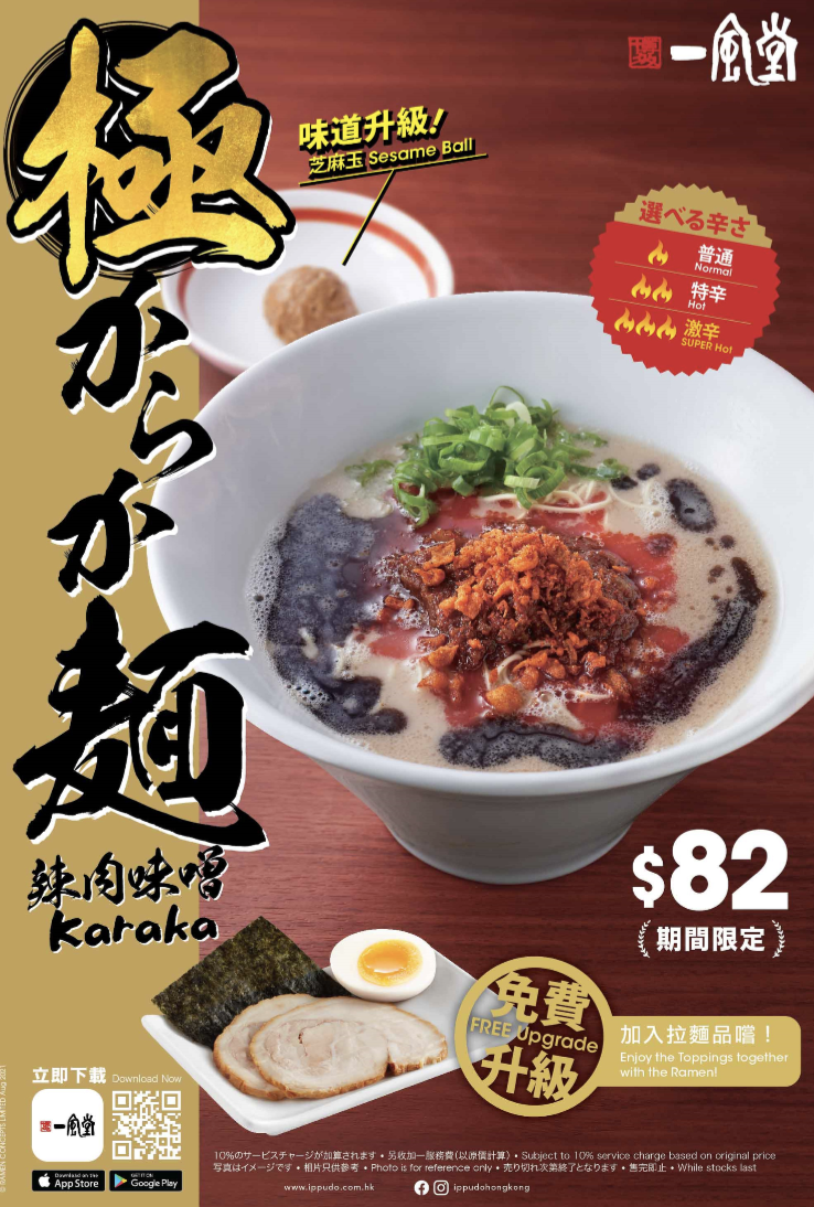 日式拉麵除了經典的豚骨、味噌拉麵,還有黑蒜、辛辣等不同口味,一風堂引入日本35周年特別版拉麵「極·辣肉味噌拉麵」,提供三種辣度讓嗜辣的食客逐級挑戰,以辣肉味噌醬帶來辛辣刺激感。