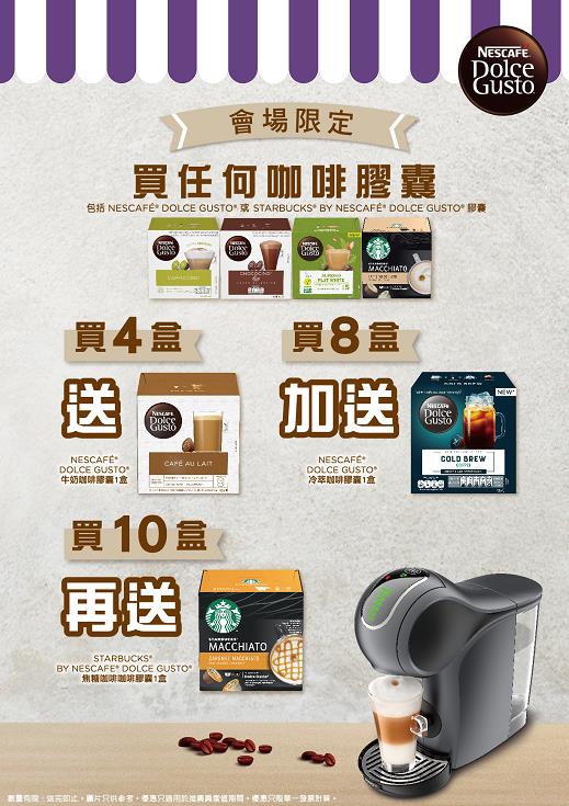 想感受一下咖啡機的嶄新功能?品牌由即日起於旺角The FOREST及荃灣D·PARK愉景新城設置期間限定咖啡體驗亭,可輕鬆打造專屬的Coffee Corner。屆時,除了可以體驗咖啡機的全新Espresso Boost模式外,更可以享受會場各種獨家優惠,包括以超笱限定優惠價購買咖啡機連膠囊套裝,買滿$499 Dolce Gusto膠囊或Starbucks by NESCAFÉ Dolce Gusto咖啡膠囊,即可加$398換購全新Genio S Plus咖啡機一部或加$468換購Genio S Touch咖啡機一部。此外,只要於會場買滿4件、8件或10件咖啡膠囊,即加送額外最多3盒咖啡膠囊。