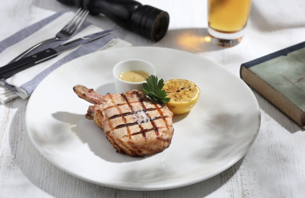 香烤北美豬扒,精選帶骨的豬鞍部位,簡單以鹽及胡椒調味,再香烤封存肉汁。