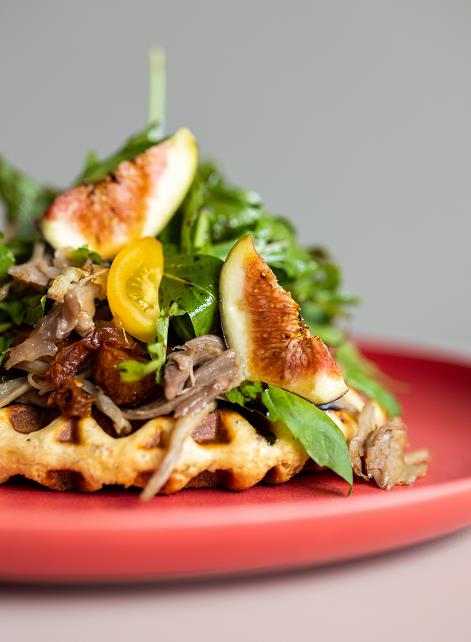 油酥鴨窩夫HK$158,原隻法式慢煮鴨腿以傳統鹽醃油封製法,低溫烘烤而成,配以火箭菜、無花果、蜜糖紅菜頭醬和窩夫,味道濃郁而不膩,鹹中帶甜,建議佐以紅酒。
