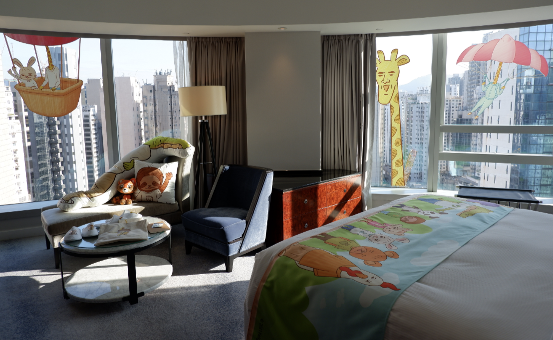 推廣期間,家族成員包括擁有超長嘴巴的鱷魚、脖子過長的長頸鹿、慢活的樹獺等,將遍布酒店大堂、電梯、專屬主題客房和餐廳。主題客房的布置,則包括多款Keigo家族的抱枕、Keigo人氣作品,亦設有電視放映得意動畫。玻璃窗及浴室更貼上了可愛的長頸鹿貼紙,連房內拖鞋也是Keigo造型,入住全景商務客房更有1.5米高的巨型鱷魚抱枕!