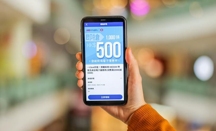 港鐵旗下商場推出「一Click即搶全城賞」推廣活動,送出850萬元、超過2萬個電子優惠券名額,MTR Mobile登記用戶可於11月8日下午2時起,透過MTR Mobile 「我的獎賞」搶先領取HK$400電子優惠券(名額:20000)及HK$500時裝及美容電子優惠券(名額:1000)。