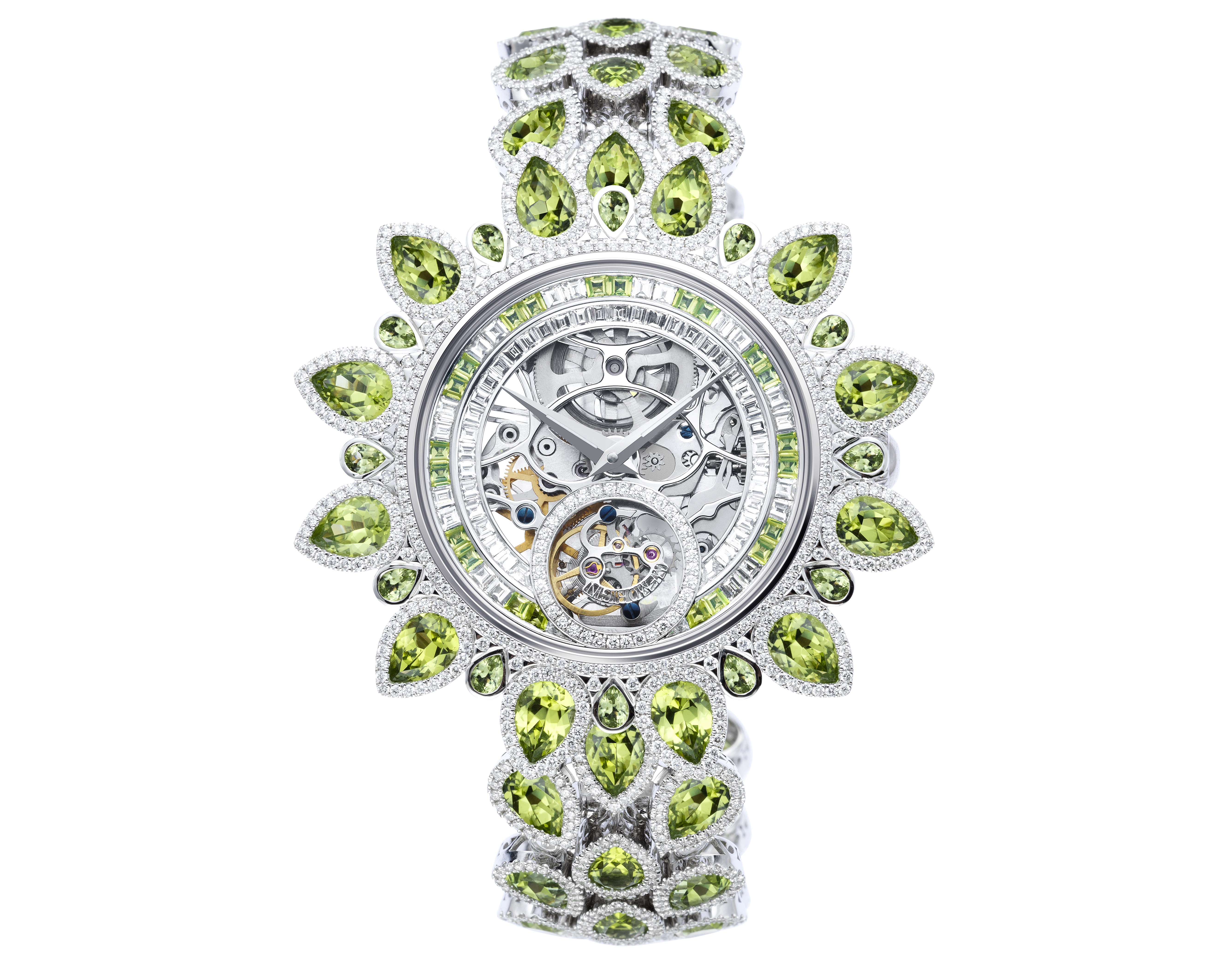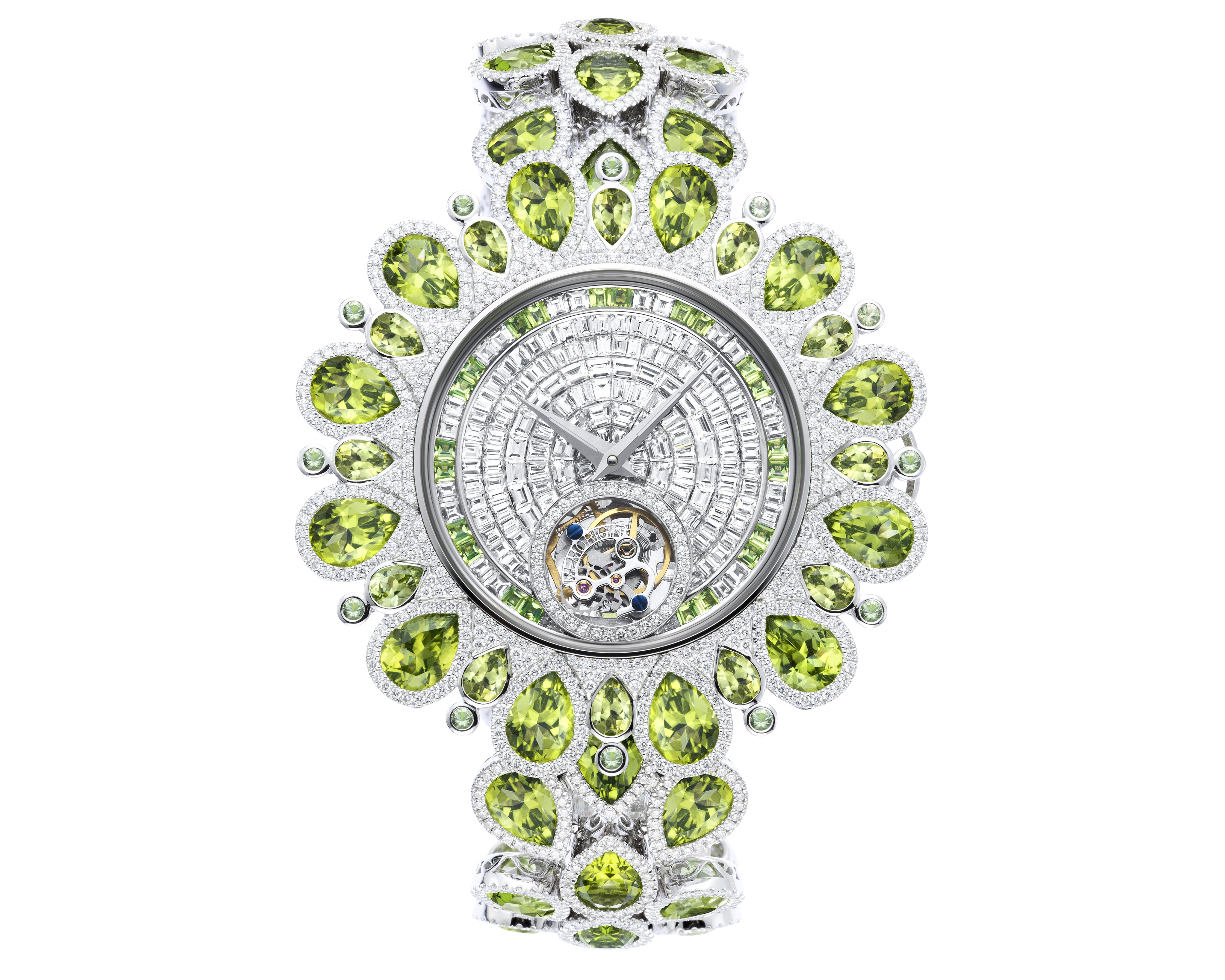為了完美展示橄欖石的美態,設計師以不同大小及不同形狀的橄欖石貫穿全表。以梨形切割的橄欖石為主軸,設計了兩款高級珠寶腕表「太陽寶石系列-月亮」及「太陽寶石系列-太陽」陀飛輪。每款全球限量僅一枚。