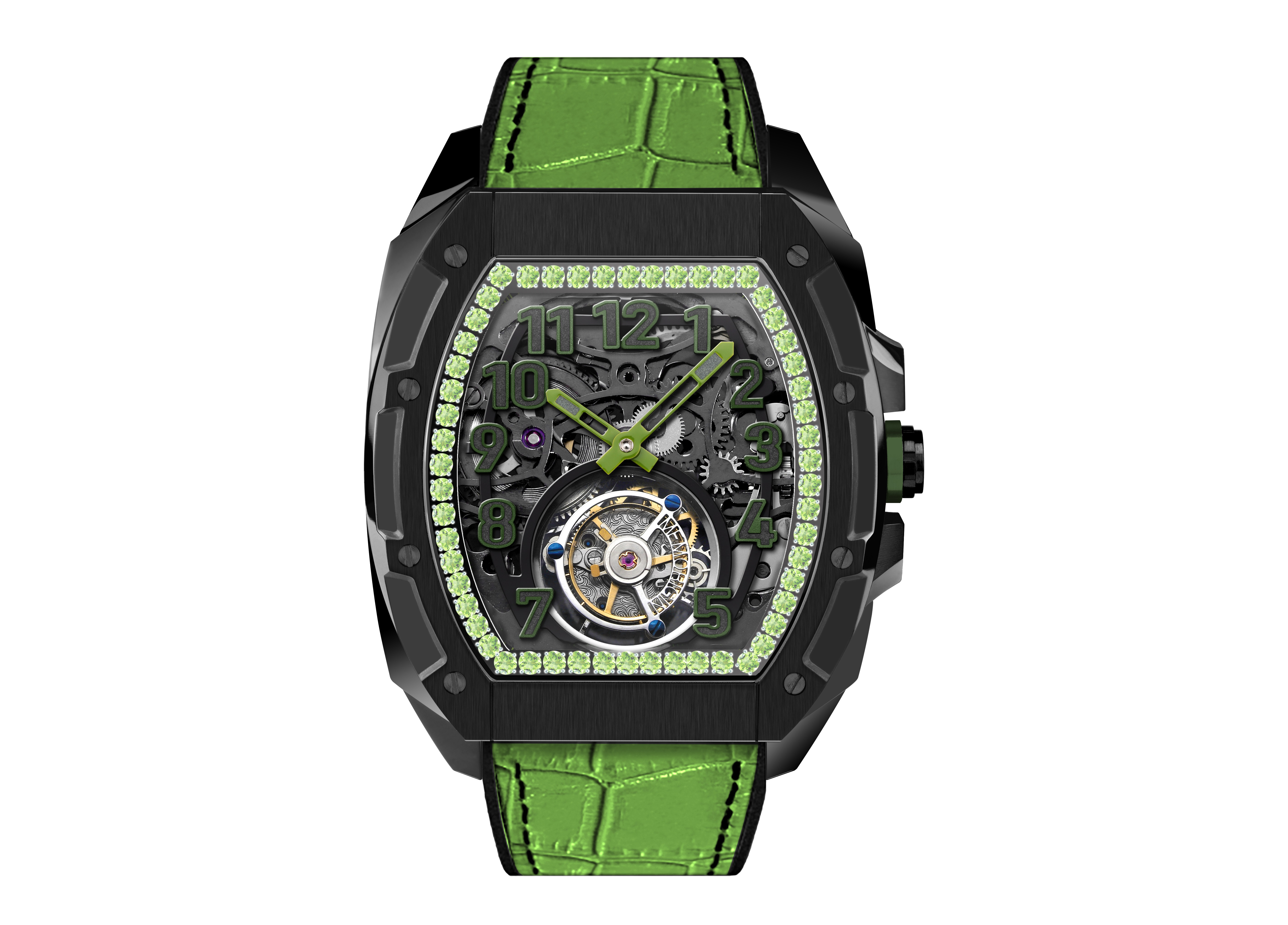 「隕石」以黑色為主調,表殼選用大表徑酒桶造型,表盤外圍飾以一圈橄欖石,於漆黑中閃著綠色光芒,與墨綠色阿拉伯數字時間刻度、指針及表帶相呼應,打造出耳目一新的型格效果。