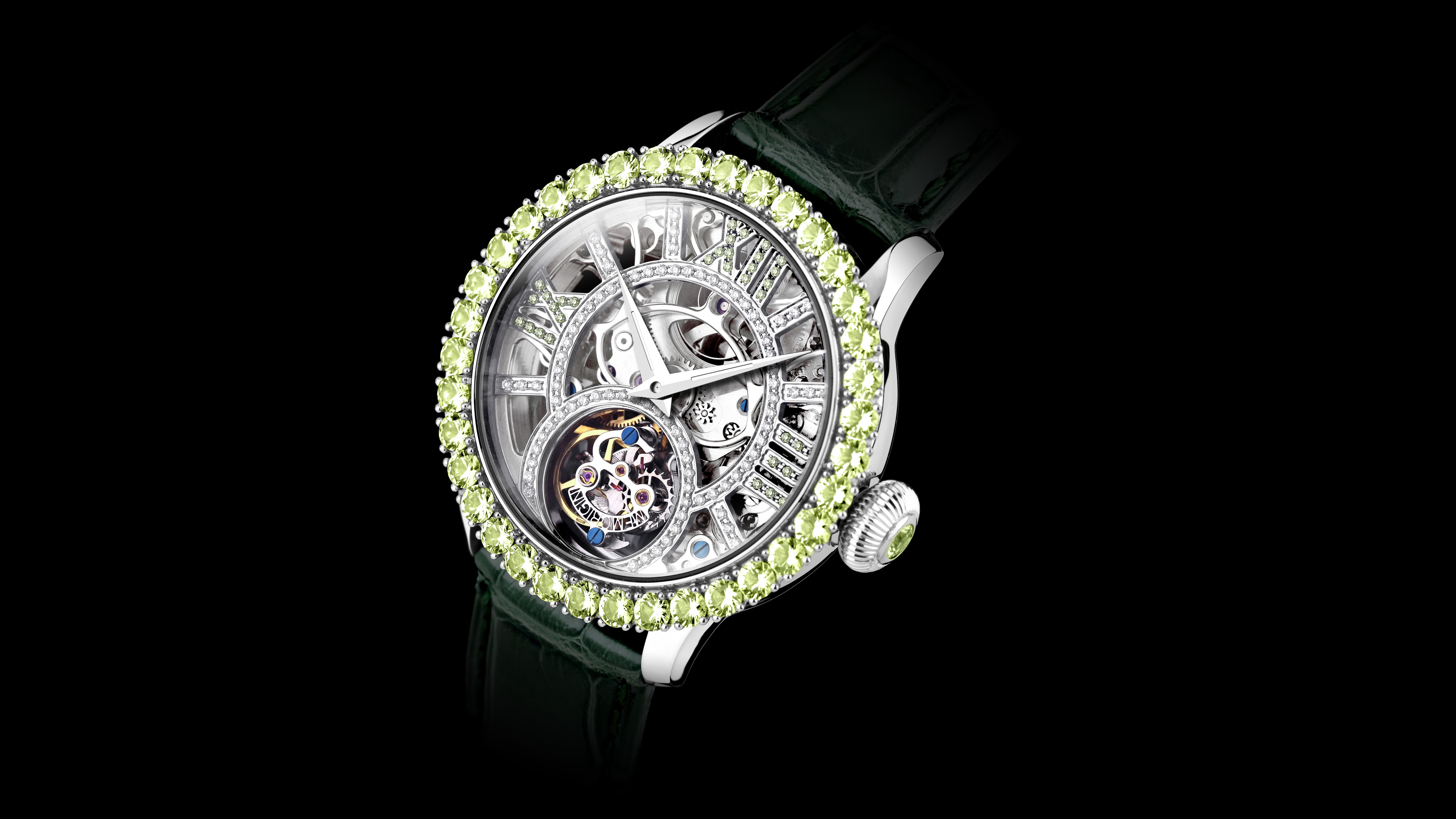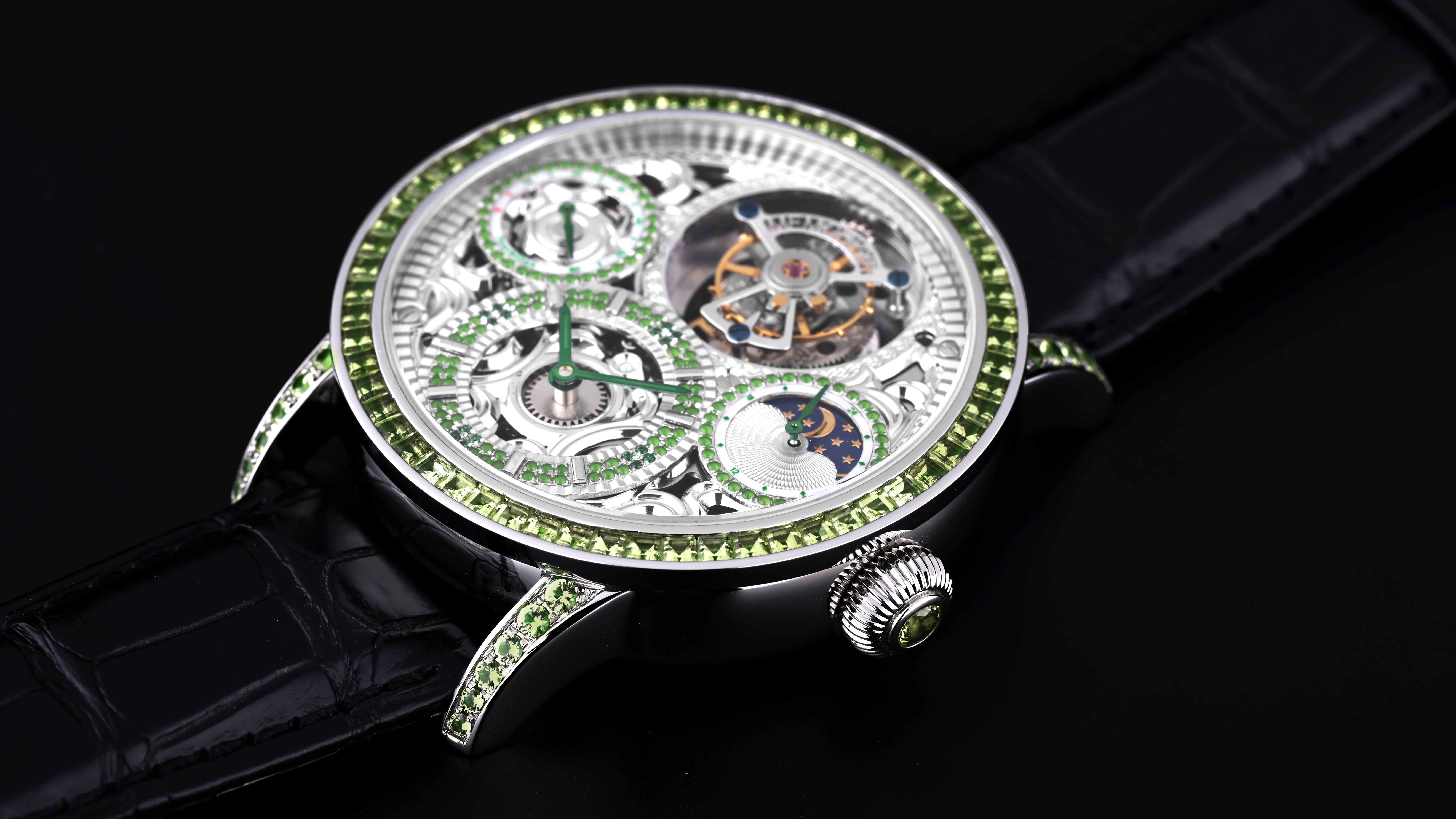 香港陀飛輪品牌萬希泉看準橄欖石的可塑性,以華麗手法結合近年時裝界流行的「綠色」,推出五款「太陽寶石系列」陀飛輪。
