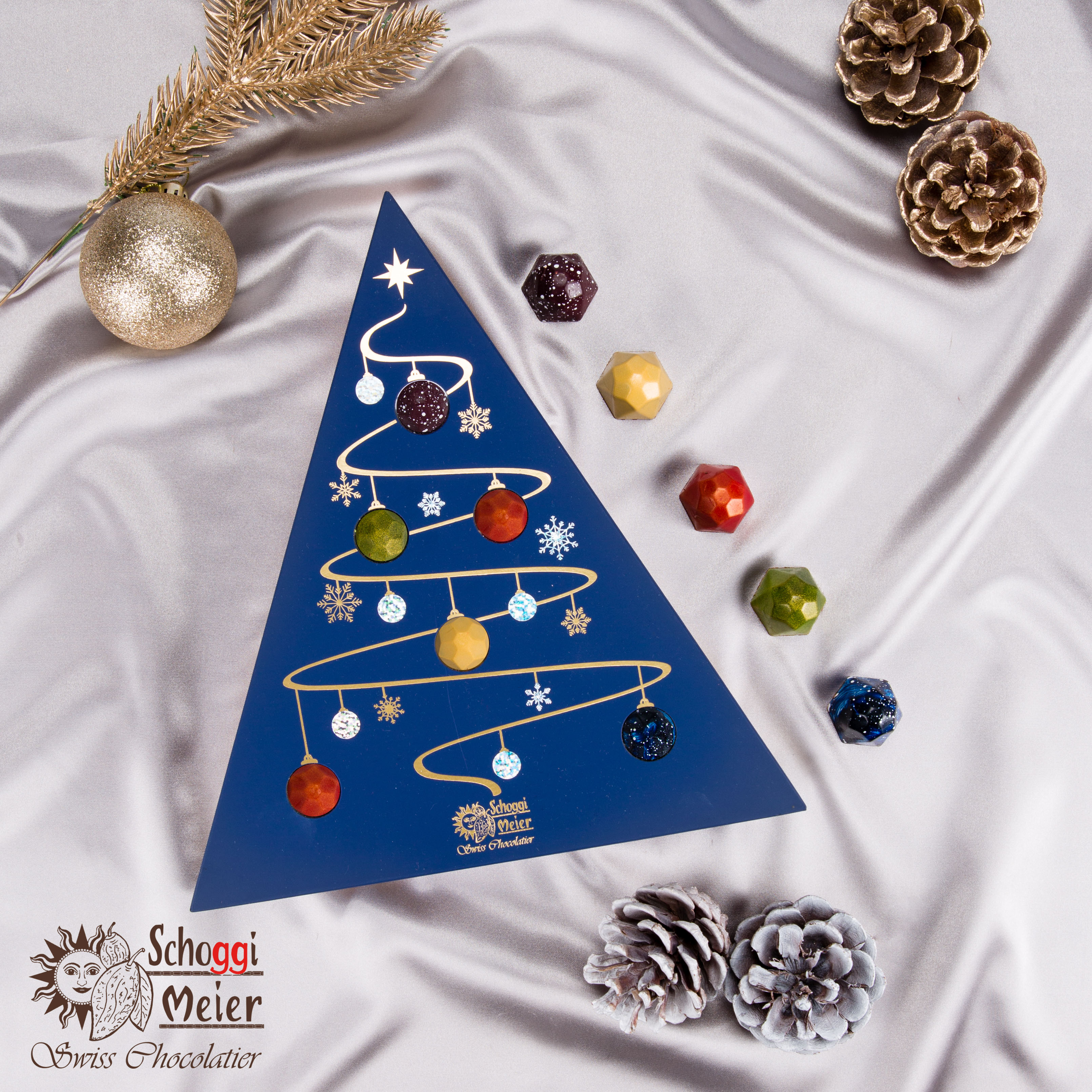 亮麗聖誕樹朱古力禮盒(10 粒裝)(HK$217),每粒均以黑朱古力外殼配以不同內餡,包括紅桑子、焦糖杏仁、黑朱古力軟心脆脆、香橙、夏威夷果仁配榛子。