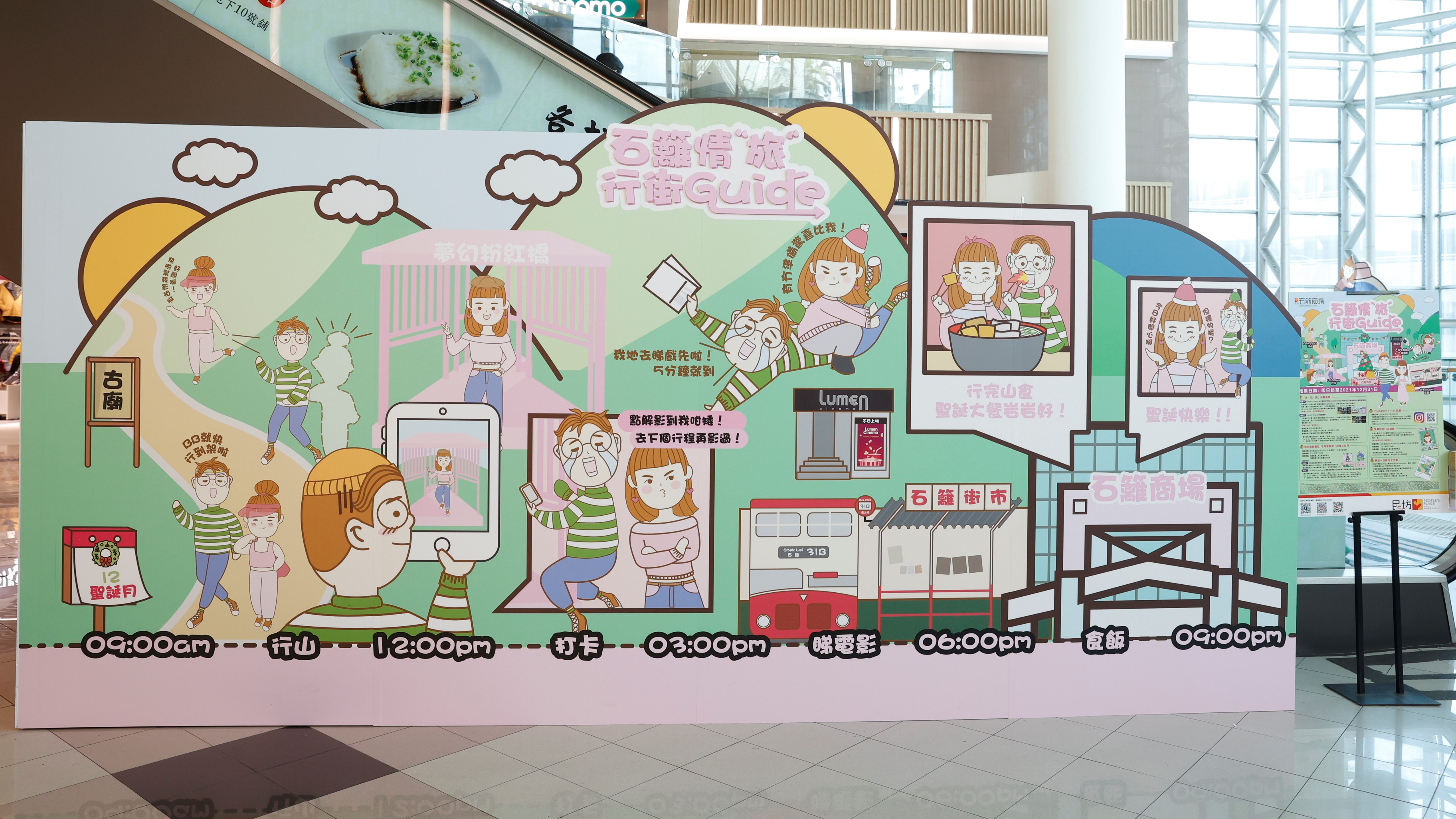 商場將石籬景點一日遊的日程表設計成大型裝置,裝置上布滿卡通人物以及石籬區內的微型景點。情侶在打卡留念後,可到推薦的景點遊覽,享受甜蜜的時光。