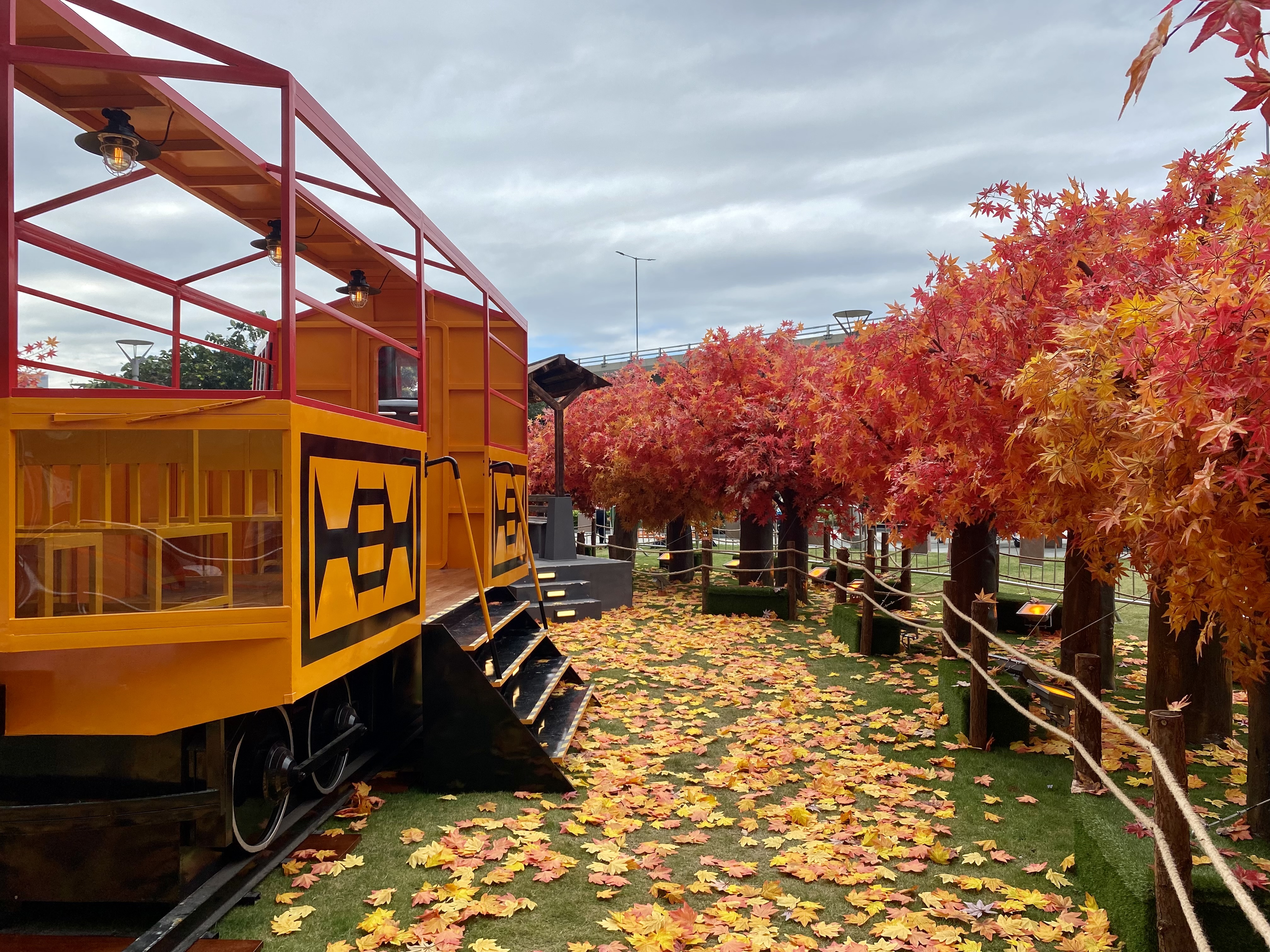 由即日起至1月2日,位於北角匯對出、北角碼頭旁的綠化地段,設有紅、橙、黃、綠、棕五色仿真楓葉園藝裝置,市民可免費遊走其中,更可與以「嵐山小火車」為藍本的火車頭及觀光車廂裝置合照,火車頭將定時響安及釋出仿真蒸氣,加上鐵道駅、火車路軌、飄散滿地的紅葉,讓市民盡享當季最美「楓」光。(記者、拍攝:Karena)