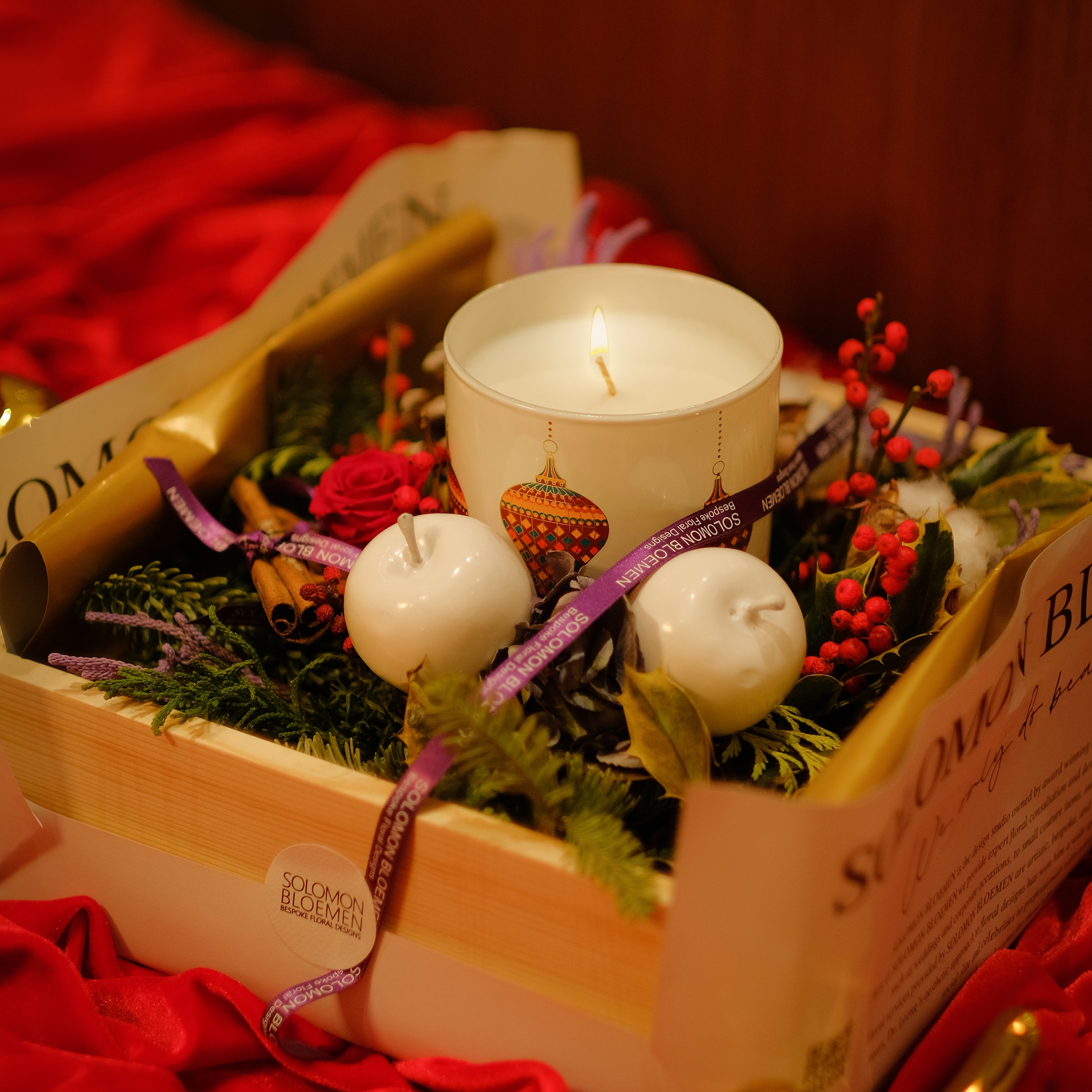 精品香水專門店Parfumerie Trésor與花藝工作室 SOLOMON BLOEMEN 合作,舉辦聖誕香氣秘密花園工作坊,參加者可親手打造備有專屬香氣的裝飾花藝。 花藝大師梁靈剛設計了花藝裝飾,取材自傳統的聖誕花環,以冷杉葉鋪在底層,配上松果、肉桂、棉花,帶來冬日聖誕氣氛,繡球花和絨球花增添幾分浪漫。