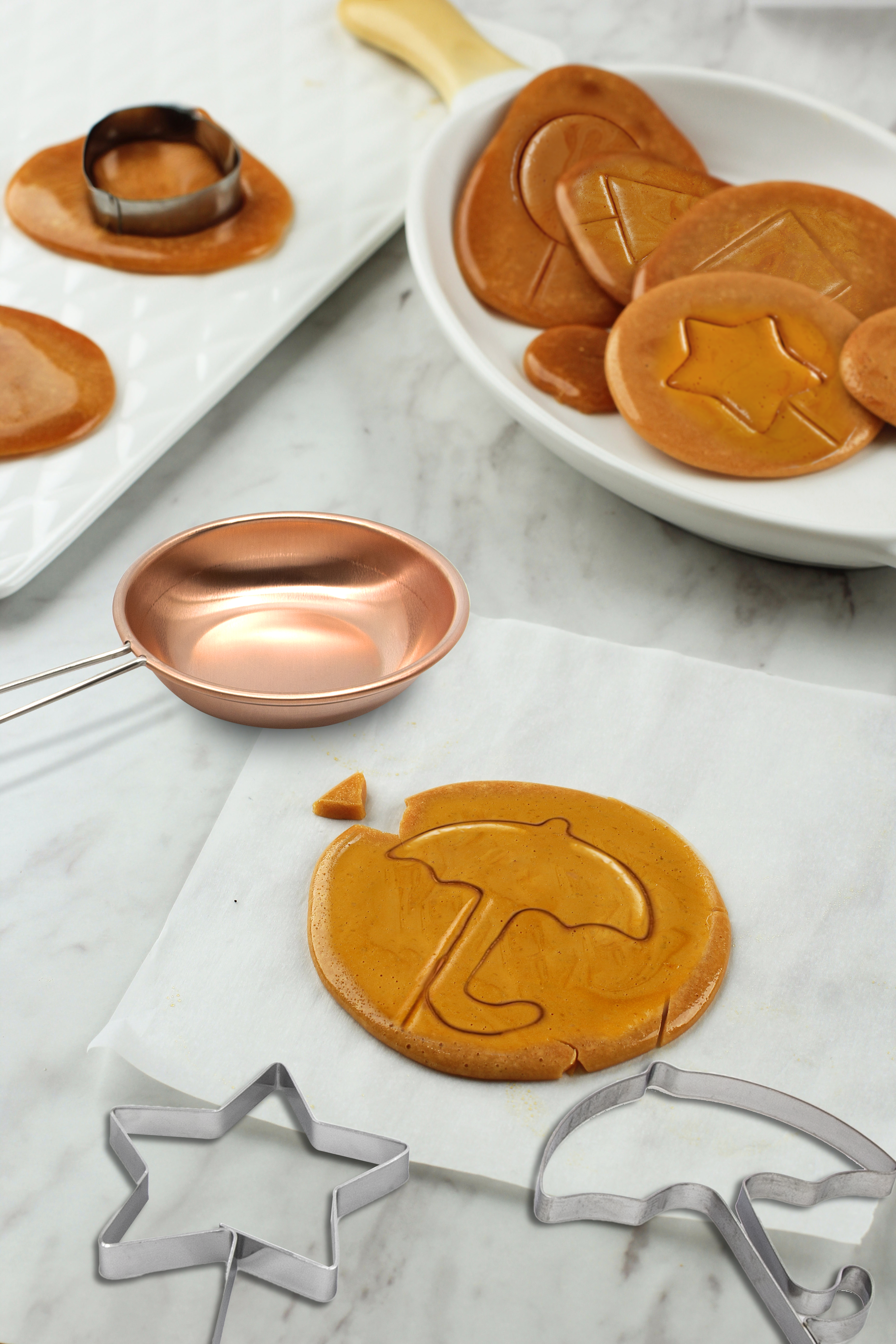 這套限量發售的椪糖套裝,內含有勺子、托盤、壓板、鏟及5款圖案造型模具,共有9件器具。只需用勺子將2至3安士的糖以小火加熱,攪拌至完全融化後關火,在勺子中加入少量蘇打粉並快速攪拌至均勻,此時融化的糖漿會呈現亮金棕色。接着在托盤上撒上一層薄薄的糖,用勺子把融化的糖漿倒在上面,並用壓板壓平,然後選好圖案模具,在椪糖上輕輕按壓,待椪糖冷卻後,只需用鏟將其從托盤上取下即成,製作非常簡單。(記者:雲遜)