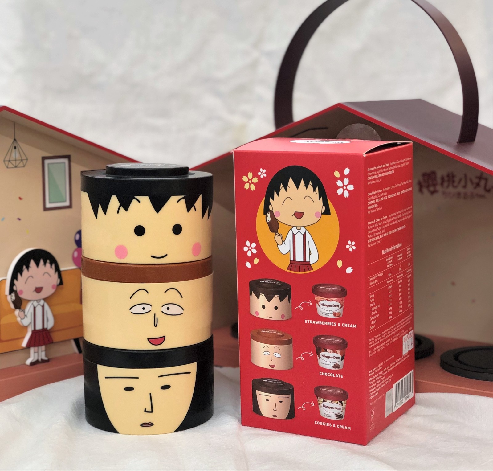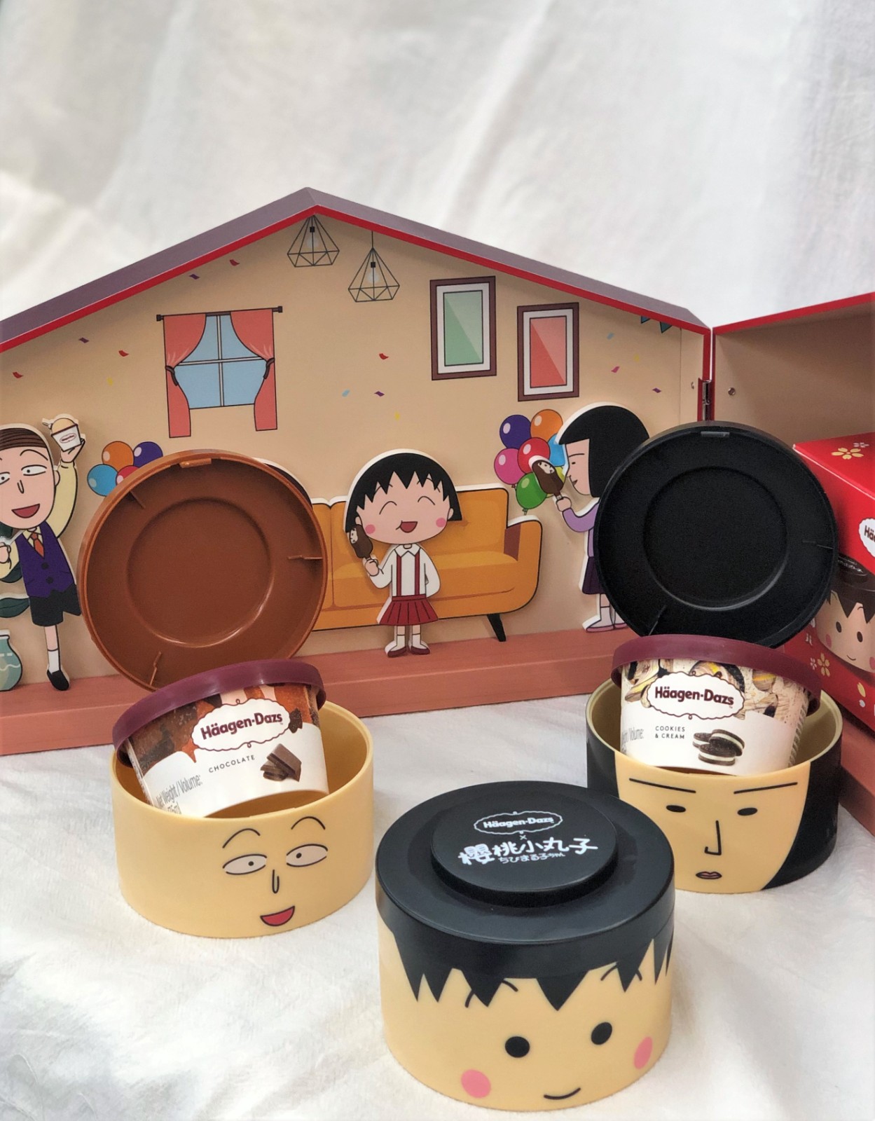 雪糕杯設計獨特,採用小丸子與好友的經典表情,外形搶眼吸睛,打開頂部蓋子,內有雪糕一杯,雪糕杯可循環再用,擺放其他物品,亦可疊高作裝飾,為家中或辦公室角落增添趣味。除此之外,品牌專門店及eShop限定推出節日福袋,內有三個小丸子、花輪同學及野口同學的大頭造型設計雪糕杯,加上家庭裝雪糕一盒 (可於Häagen-Dazs專門店換領時選擇2款雪糕口味),連同可愛、實用的小丸子粉紅冰袋,適合作為朋友聚會的禮物。