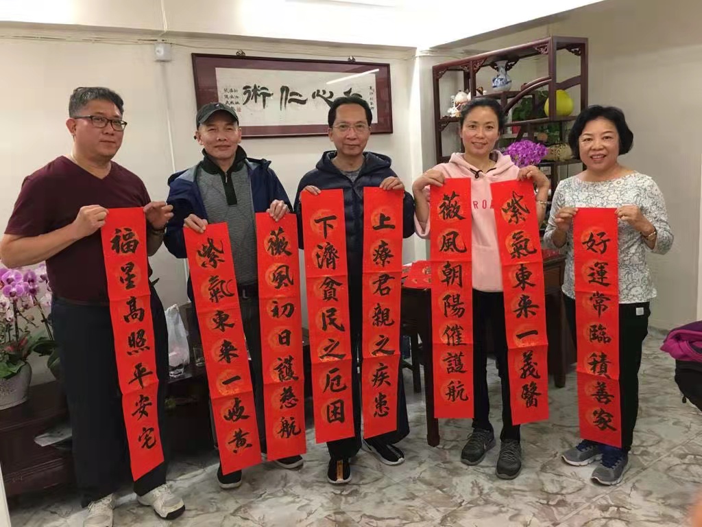 過年時,街坊朋友都熱情地寫對聯給紫薇(右二),「上療君親之疾患,下濟貧民之厄困」引的是醫聖張仲景的話,這是做中醫的宗旨,每個中醫師都應該記住。