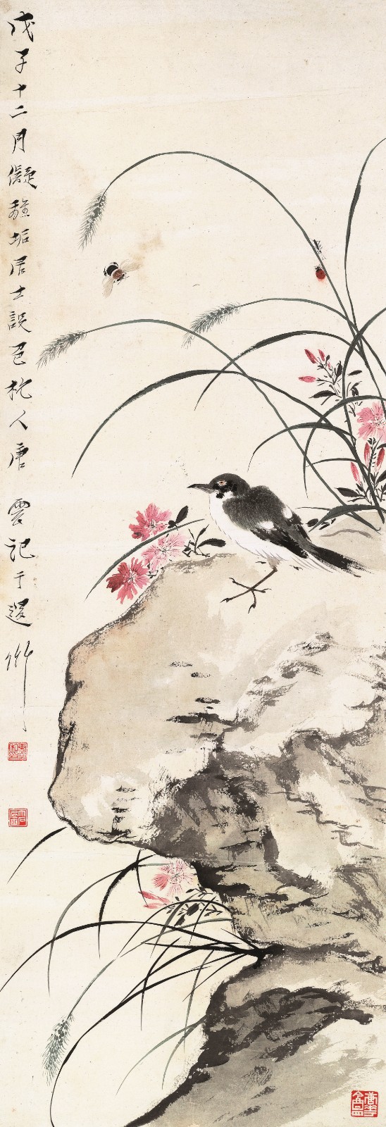 唐雲作品《花鳥草蟲》,1948年,設色紙本,100×35cm。