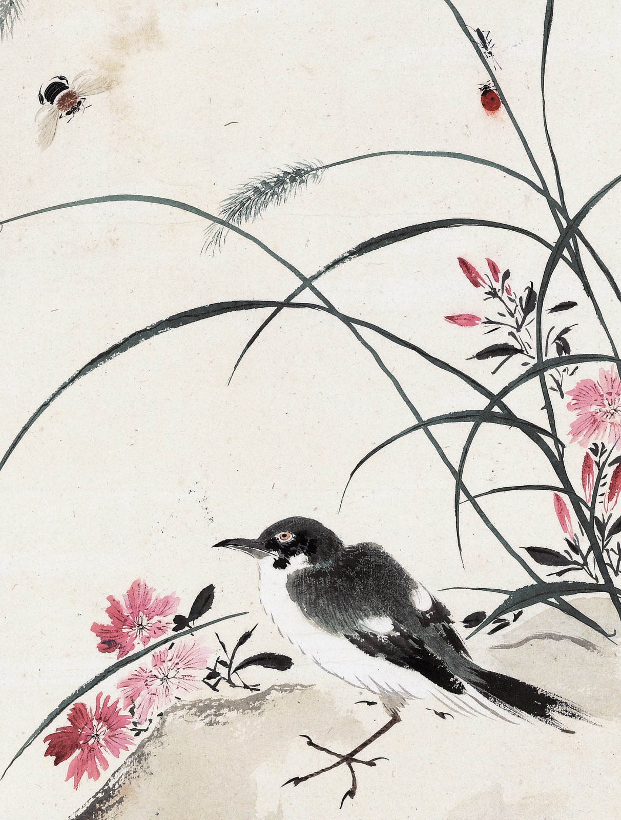 石旁草葉隨風搖曳,柔韌似有骨,具蘭蕙之姿,頂梢的穗頭顆粒飽滿,纖毫畢現。草叢間幾簇紅花點綴其中,好似雲霞般爛漫,蜜蜂圍繞花間飛舞,蟋蟀和瓢蟲順着草杆向上爬,畫面活潑生動,生機盎然。石質粗糲,花草柔韌,巨石不語,鳥樂蟲鳴,畫面雖不繁雜,卻將花鳥草蟲和諧地融匯在一起,鮮活地展現出自然中隨處可捕捉的閒情野趣,引人入勝。(文:蕭芬琪)