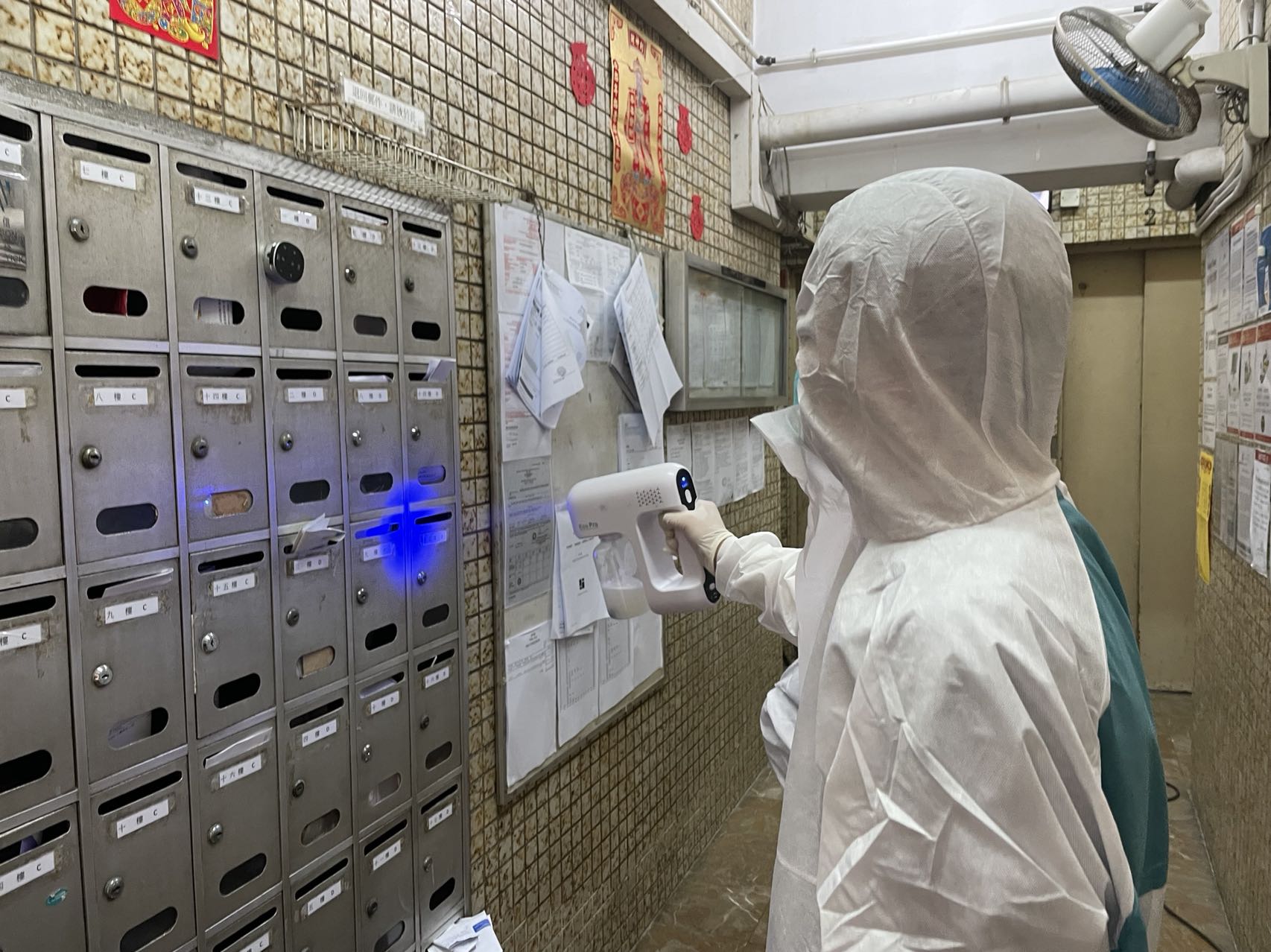 工作人員為舊式大廈大堂噴灑消毒涂層。