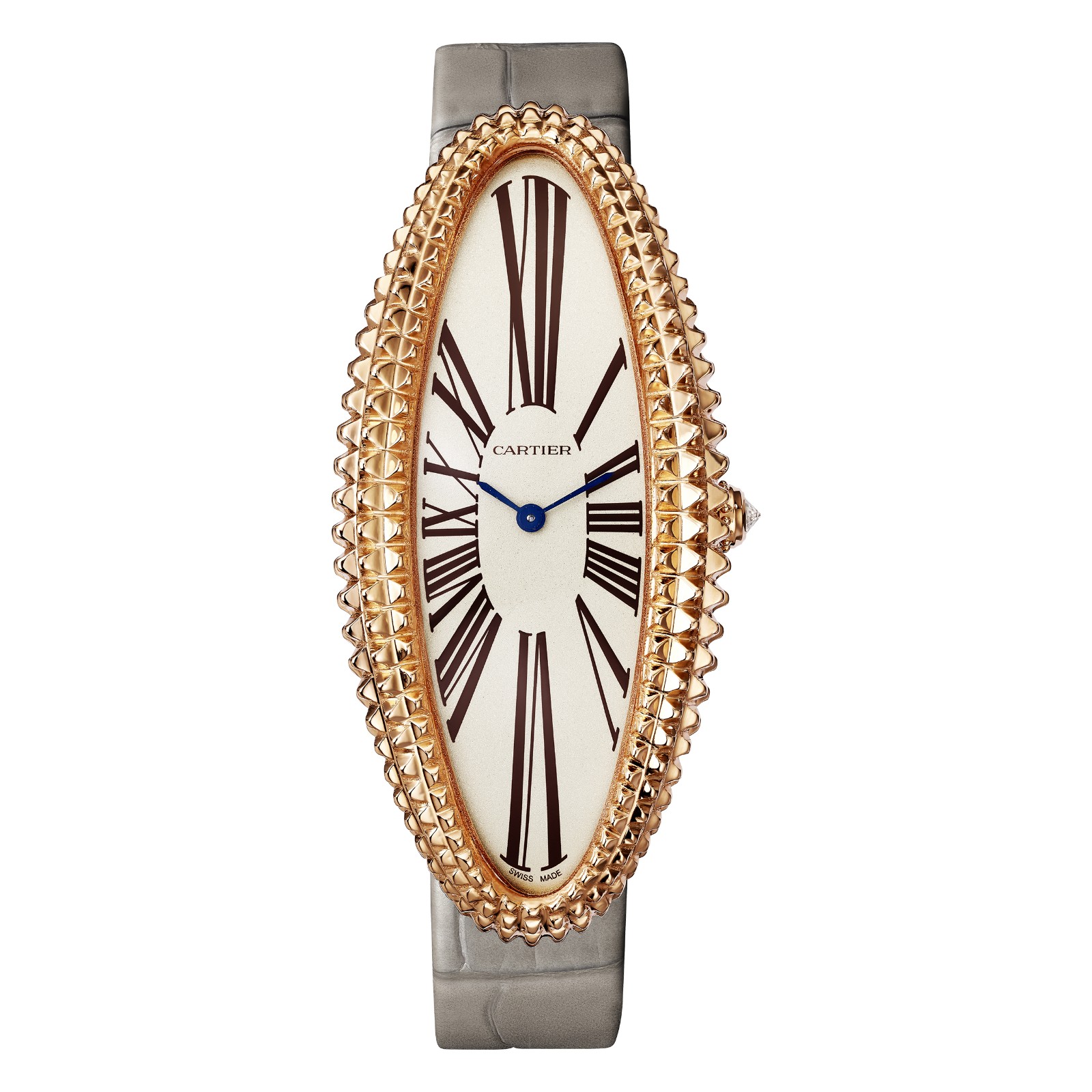 Cartier Baignoire 系列腕表,延續長方弧邊輪廓的特色,曲線令人意想到浴缸的形狀,因而以法文Baignoire(意指「浴缸」)命名。表款不但以鑽石鋪鑲表盤,更綴以「巴黎飾釘」雕刻金打造的表圈,延伸於女性腕間,展現時尚風格與俐落個性。