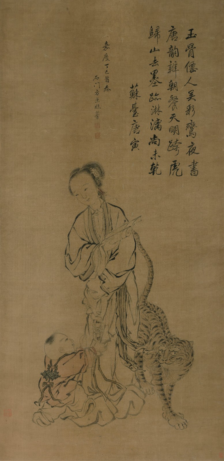童宇以展品之一、方薰的《摹唐寅玉骨仙人軸》舉例說明:「畫中老虎是典型的可愛形象,似笑非笑,身軀扭動成『S』形,依偎在腳旁,恍如貓咪一樣在撒嬌。畫家臨摹明代畫家唐寅的作品,描述了《傳奇》中仙女吳彩鸞故事。」《傳奇》有記,吳彩鸞洩露天機被貶下凡,與書生文簫成親,由於夫君窮困,彩鸞便靠抄寫維持家計,又訓練十數位童子,十年後夫妻二人同時跨虎升仙。作品中彩鸞持書,身旁有虎與童子,反映了《傳奇》記載。